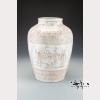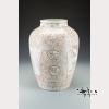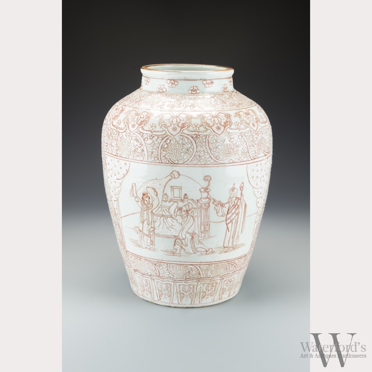 19th/20th century, Qing dynasty. The large white jar decorated with white and iron red overglaze enamels to depict scenes from the folktale Bai She Zhuan or Legend of the White Snake Maiden. In one scene the Snake Maiden, Baisu Zhen, is being captured by the Monk Fahai before being imprisoned in a temple. The other scene is Baisu Zhen after being freed from the temple, reuniting with her husband and son. The scenes in square panels surrounded by floral meander, which also surrounds the four attributes of the scholar: chessboard, lute, book and scroll paintings. Cloud scroll around shoulder and lappets around base. Six character underglaze blue "Yi You Bao Ding Zhe Zhen" mark to base. Approx. 16 by 11 in., 41 by 28 cm.