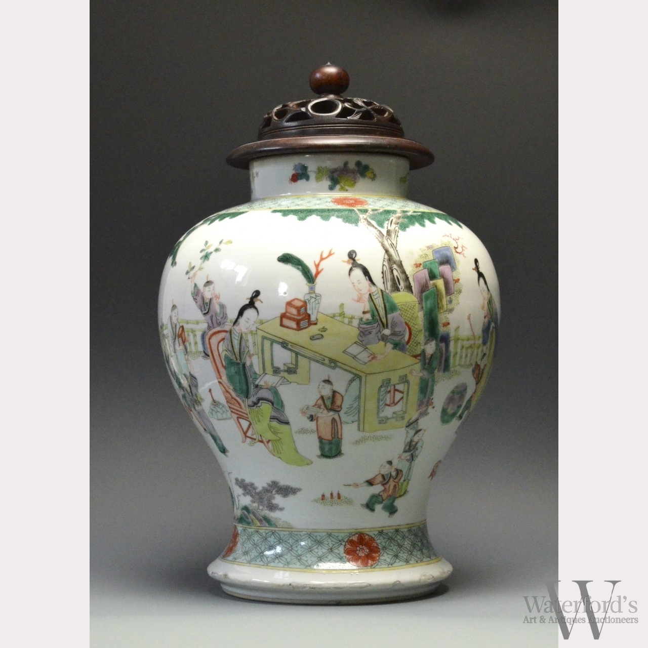19th century, Qing dynasty. The jar with a flaring foot rising to a high, wide shoulder and narrowing to a short, straight neck, decorated in polychrome overglaze enamels to depict women and boys in a landscape. With a pierced and carved wood lid. Unmarked base. With lid, approx. 15 1/2 by 9 1/2 in., 39.5 by 24 cm.