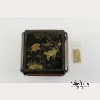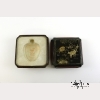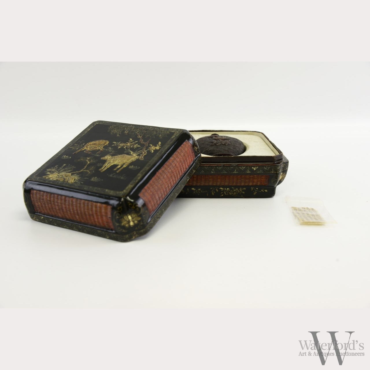 19th century, Qing dynasty. The snuff bottle carved in high relief on both sides with a phoenix standing on a turtle's back amidst incised waves, with horn stopper. The bottle fitted in a black and cinnabar lacquer box with the gilt image of two oxen in a landscape above shaped sides with cinnabar lacquer carved basket weave panels between gilt lotus flowers, with four character gilt xingshu Kangxi mark to the interior. Provenance: Property of an English Estate. Snuff bottle approx. 3 3/8 by 2 1/2 in., 8.2 by 6.5 cm. The box approx. 3 by 5 1/2 by 5 1/2 in. 7.6 by 14 by 14 cm.