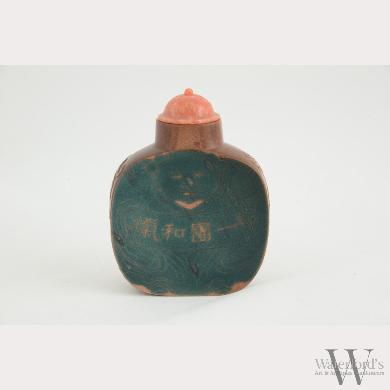1736-1800, Qianlong period, Qing dynasty. Attributed to the Imperial Glassworks, Beijing, the rare snuff bottle with a flat lip and recessed oval foot with one flattened side while the other cast in relief in caramel brown glass suffused with shimmering crystalline copper iridescence. The flattened side covered in iridescent green overlay carved to depict one of Hehe Erxian twins carrying a banner with an inscription that reads ?yi tuan he qi? which can be translated as ?harmony at all times.? The reverse side cast in relief to depict the bajixiang, or eight Buddhist emblems. With a coral glass stopper. Provenance: Martin Schoen, Bonham's New York March 22, 2011, The Linda Riddell Hoffman Collection of Chinese Snuff Bottles, lot 132. Illustrated: B.Stevens, 'The Collector's Book of Snuff Bottles', New York and Tokyo, 1976, fig.493. With stopper approx. 3 1/2 by 2 1/2 in., 9 by 6.5 cm.