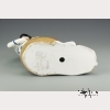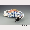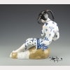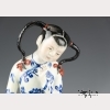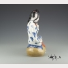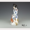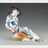 Mid-20th century, Republic period or Early People's Republic. A porcelain beauty wearing a blue and white long tunic with cropped pants and braids in her hair is seated among rocks along the sea shore, using a red sash to play with a crab climbing out of the waves. Two stamped fantizi traditional character marks to base, the first a circular mark with "Xu jian Jianzhi" the second mark of the Jingdezhen Sculpture Porcelain Factory "Jingdezhen diaosu ci chang." Approx. 11 1/2 by 12 in., 29.3 by 30.6 cm