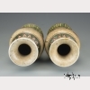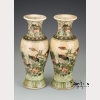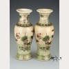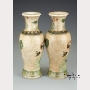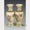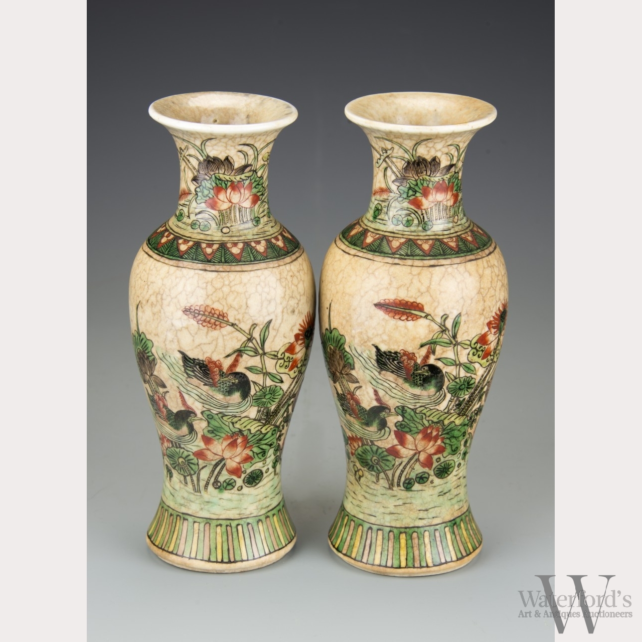 20th century. The baluster vases covered in a cream glaze with brown crackle, decorated in famille verte overglaze enamels to depict pairs of mandarin ducks swimming among lotus flowers. Mandarin ducks live in pairs and mate for live and are thus symbolic of a happy marriage, by swimming among lotus flowers it is a wish that the couple will be blessed with many sons. Lappet borders around the foot and shoulder with additional lotus flowers on the necks. Unmarked bases. Approx. 9 3/4 by 3 3/4 in., 24.8 by 9.5 cm.