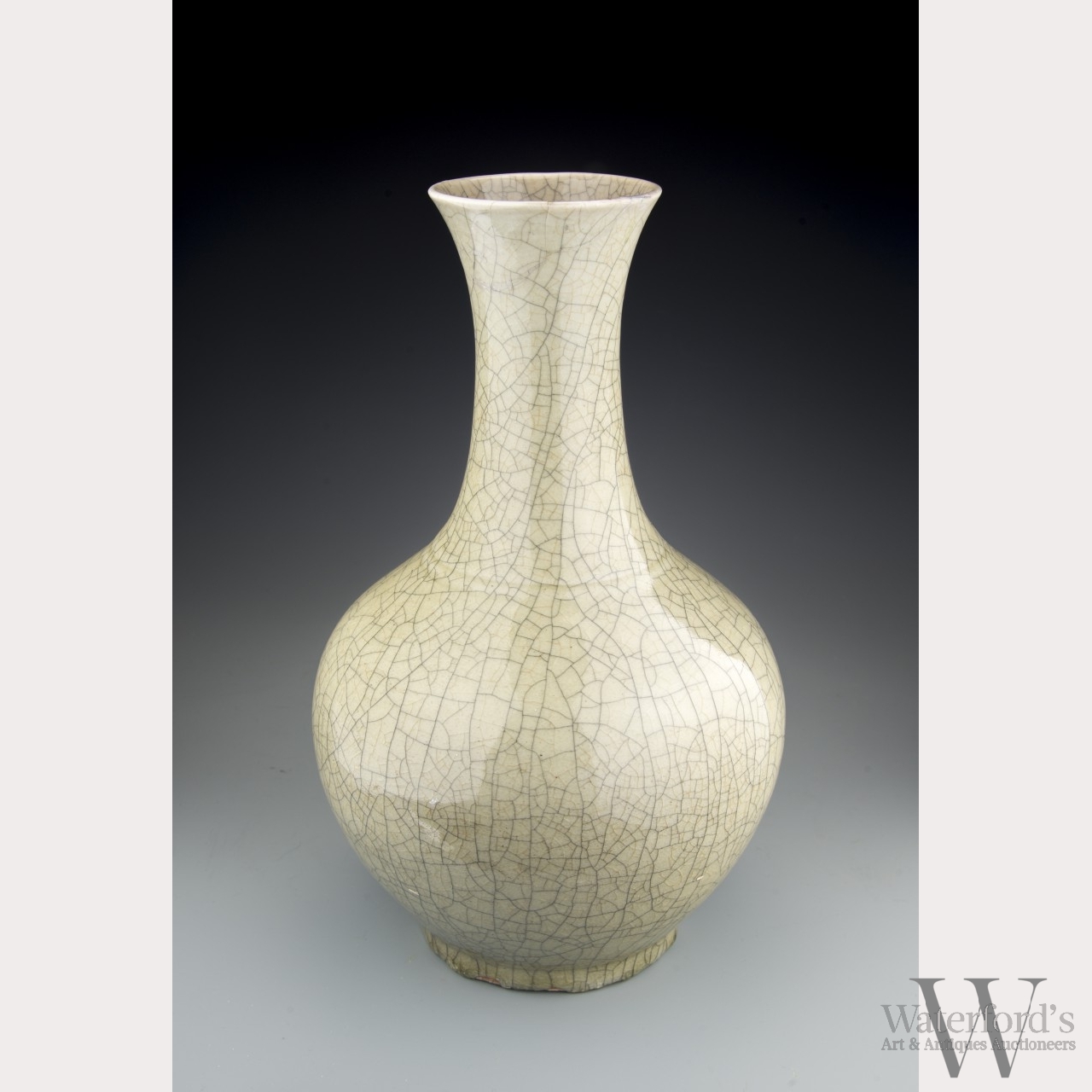 Late 19th/early 20th century, Qing dynasty. The vase with a bulbous body and tall flaring neck, on a tall foot ring, covered in a translucent grey glaze that thins to a cream color, with dark and light networks of crackle over the entire surface. Unmarked base. Approx. 14 3/4 by 8 1/2 in., 37.5 by 21.6 cm.