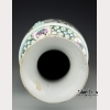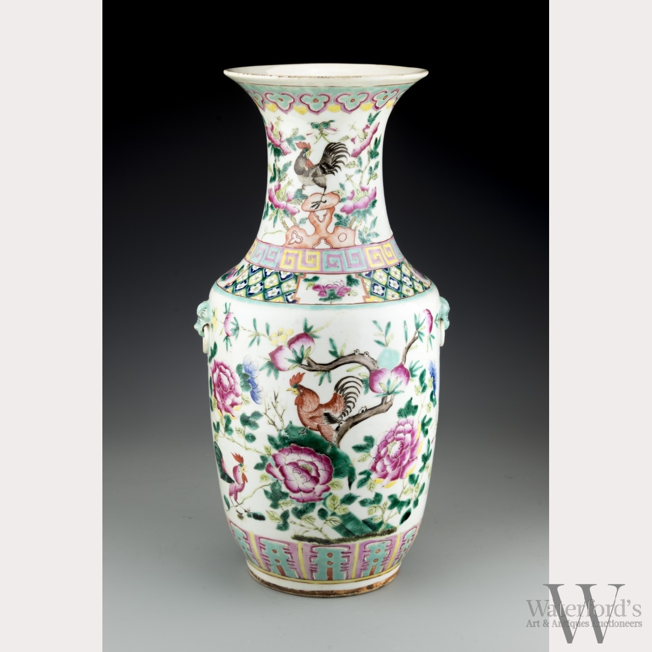 19th century, Qing dynasty. The tall rouleau vase with flaring neck and two opposing faux fu dogs holding rings handles, decorated with famille rose overglaze enamels to depict roosters among peonies on the body and neck, lappets around base, lozenge and key fret borders on shoulder and ruyi head border around lip. Approx. 17 5/8 by 8 1/2 in., 44.8 by 21.6 cm.