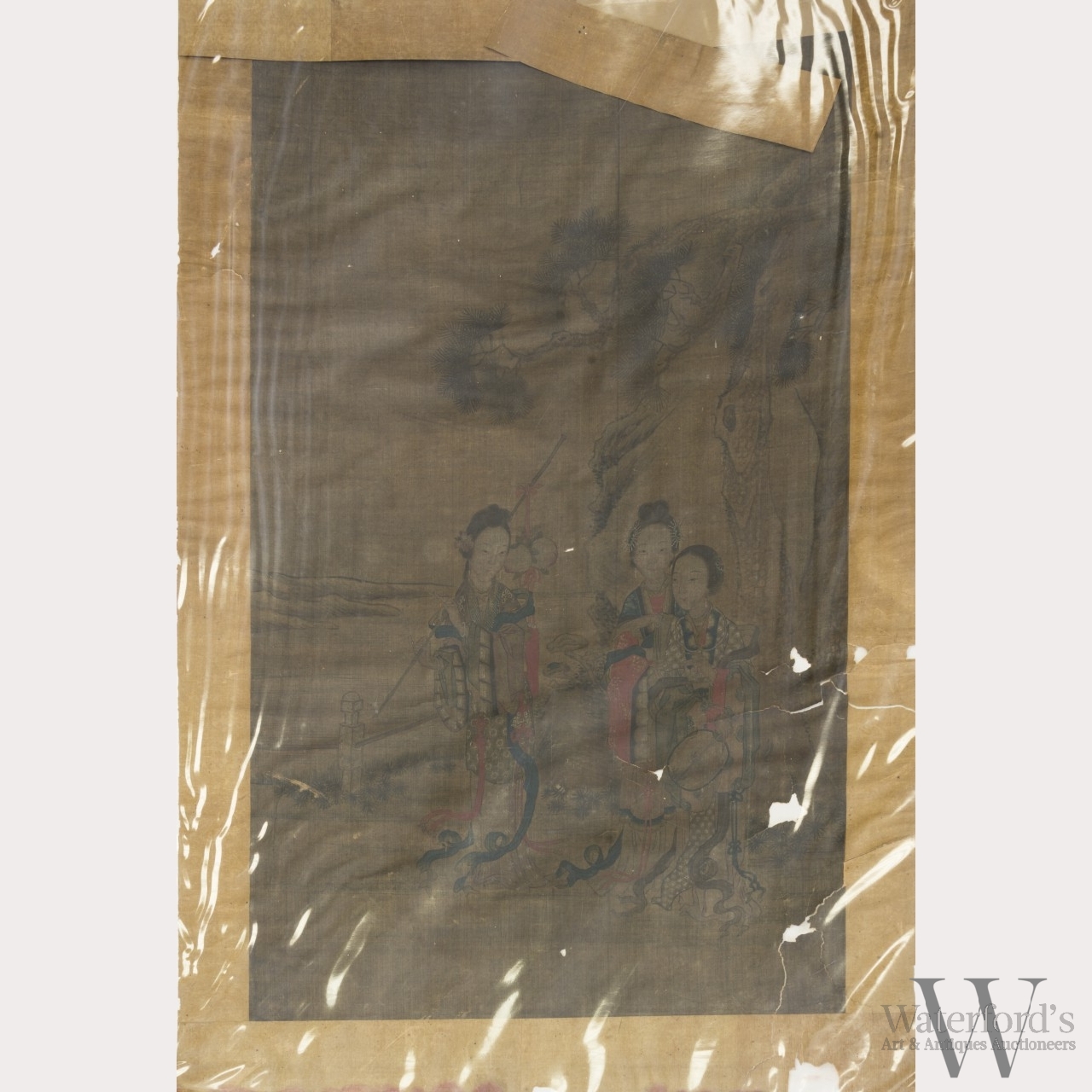 18th century, Qing dynasty. Ink and color on silk, un-mounted hanging scroll with silk border. Beautiful Qing dynasty women stand sumptuously dressed beneath a tree, their make-up carefully done, and hair adorned with jewels and flowers. One is holding a fan, another carries a stick over her shoulder from which peaches are suspended. Mounted in a silk brocade border. Approx. 32 by 19 3/4 in., 81.3 by 50.2 cm.