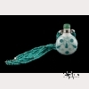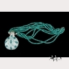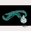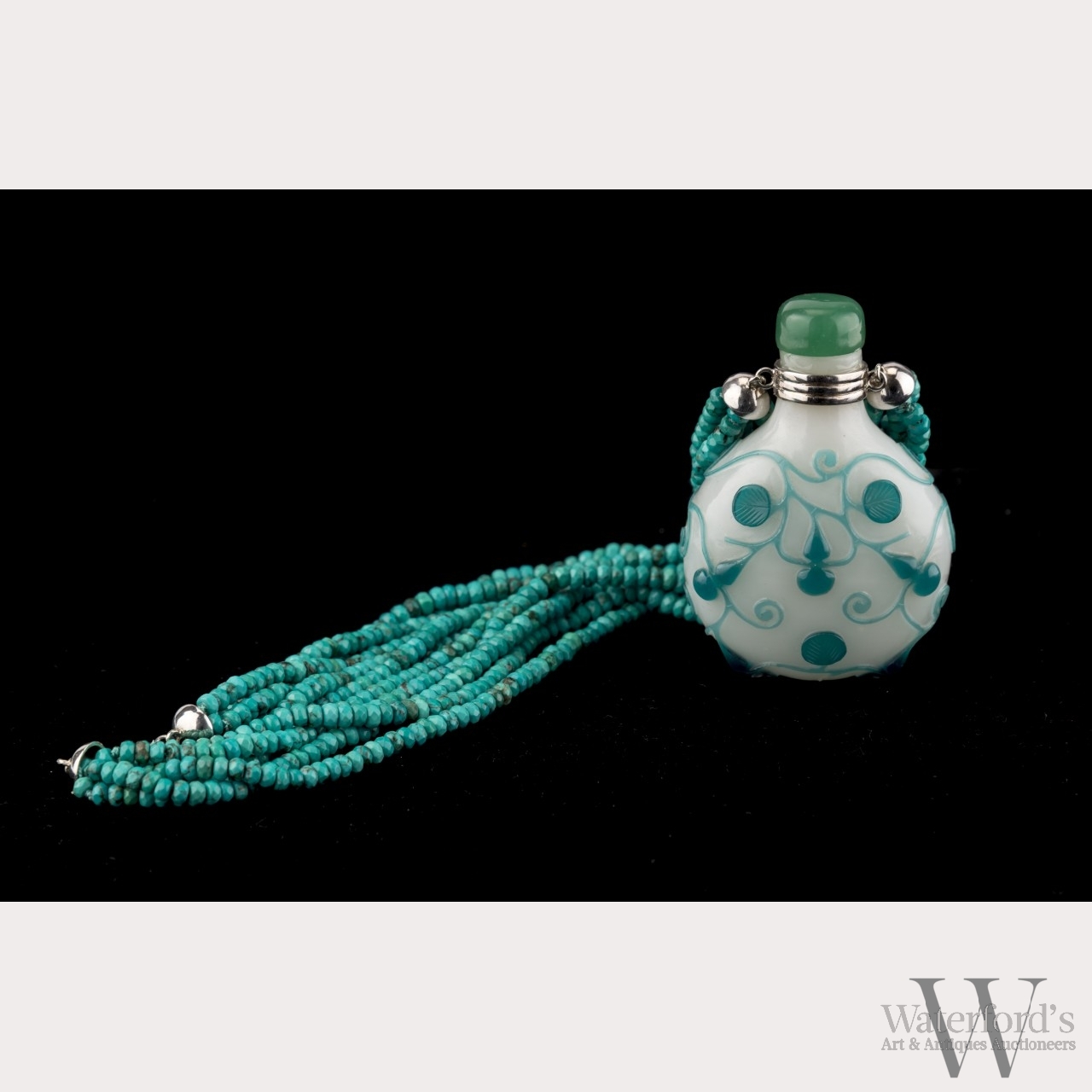 Late 19th century, Qing dynasty. The flattened round white Peking glass snuff bottle with turquoise blue overlay of gourds on a vine, with three of the gourds serving as a tripod on which the bottle stands. With green Peking glass stopper. Mounted as a pendant on a five-strand faceted turquoise bead 17-inch necklace. Stopper fixed to bottle. The bottle approx. 2 3/4 by 2 in., 7 by 5 cm.