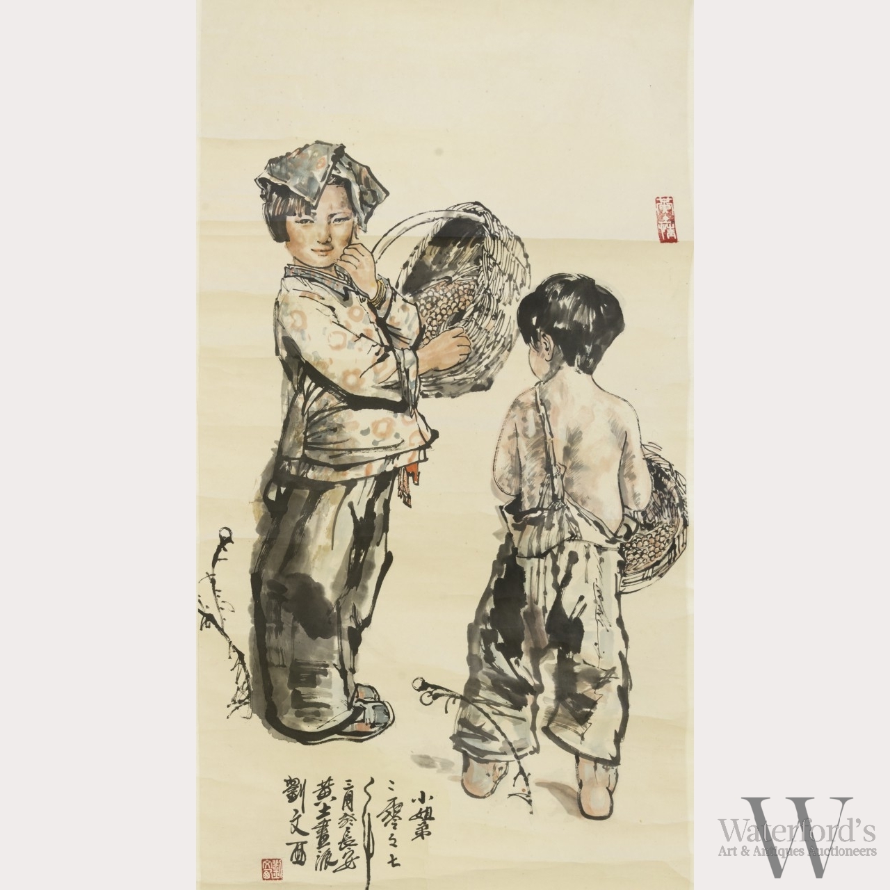 Painted March, 2007 in Xi'an, Shaanxi Province. Ink and color on paper, mounted as a hanging scroll. The painting depicts a young girl wearing a white floral shirt with matching cloth hat and black pants, holding a basket of berries, one hand raised as if tasting one. Next to her, her younger brother stands shirtless with his back to the viewer, wearing light blue pants held up by a shoulder strap. He too holds a basket of berries. Artist's dated inscription and seal to lower left, additional seal to upper right. Liu Wenxi is the leader of a school specializing on painting farmers and the history of northern Shaanxi. The painting approx. 52 by 26 in., 132 by 66 cm.