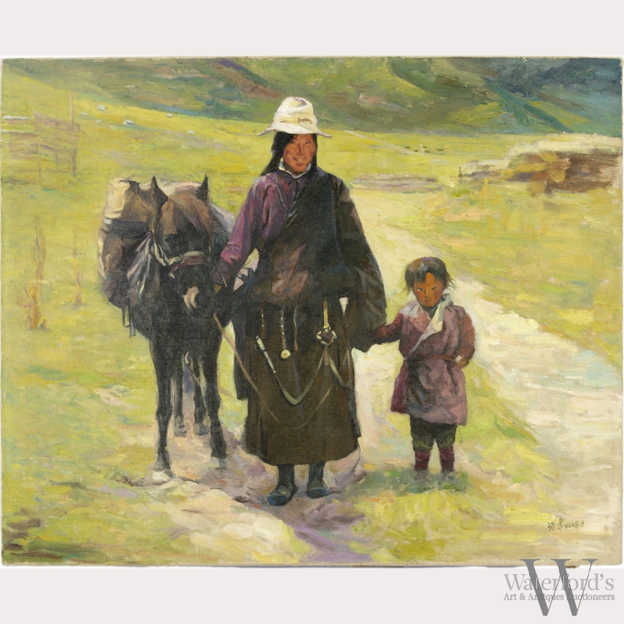 2008. Oil on canvas. Depicting a minority woman and child leading a mule across an impressionistic landscape. Signed "Fuzhang 2008" to lower right. Dong Fuzhang is a professor of fine art at the Capital Normal University in Beijing. Approx. 31 by 39 in., 79 by 99.5 cm.