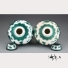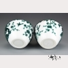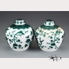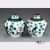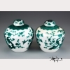 19th century, Qing dynasty. The pair of white glass ginger jars of squat ovoid form with short, narrow necks and domed covers, all with green overlay. The bodies decorated with a phoenix perched on peony branches and song birds among plum branches. A ruyi head border encircles the necks. The lids are decorated with peony sprays. On recessed foot-rings. Approx. 5 � by 5 in., 14 by 12.7 cm.