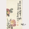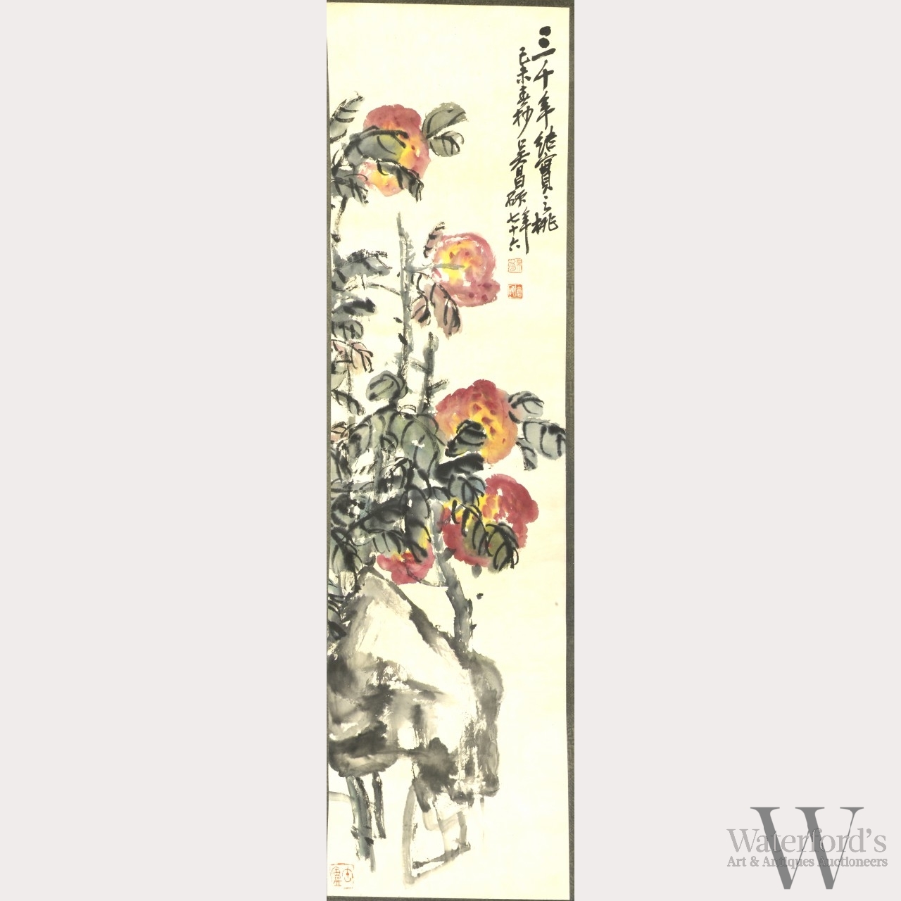 1919, early Republic period. Ink and color on paper, hanging scroll. Wu Changshuo was a well-known painter, calligrapher, and seal carver. This painting depicts several ripe pink peaches on branches, representing longevity. According to the inscriptions on the right, it was painted in 1919, by Wu Chanshou at the age of 76. Two seals next to the inscription and one to the bottom left. Approx. 12 1/2 by 45 in., 31.8 by 114.3 cm.