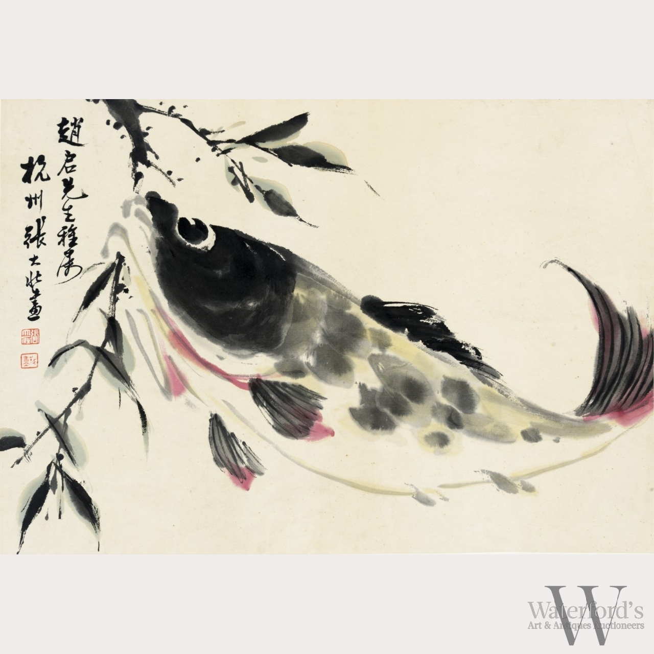 20th century. Ink and color on paper, album leaf mounted in silk. Zhang Dazhuang was a famous 20th century painter who exceled at ?bird and flower? painting. Here he depicts a vibrantly painted fish using yellows and reds, eating an aquatic plant. To the left is an inscription by the artist stating he painted it for Mr. Zhao Qi, along with the painter's seals. Approx. 11 3/4 by 15 1/2 in., 30 by 39.5 cm.