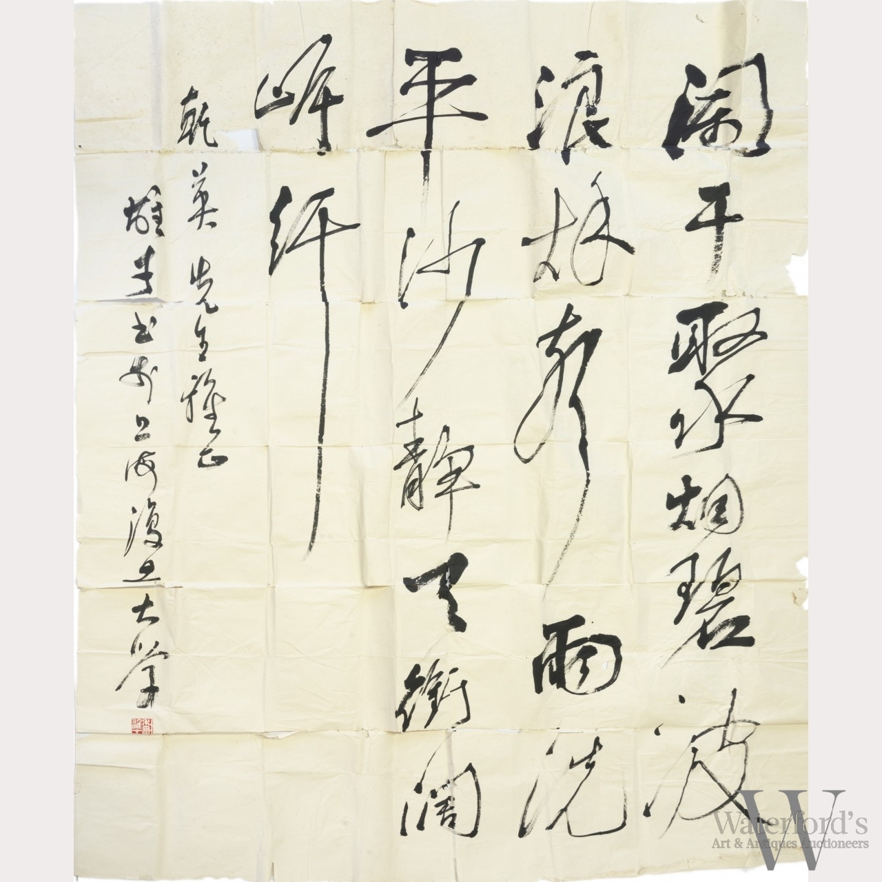 Mid- to late 20th century. Ink on paper, un-mounted. Li Xiongcai, was one of the most influential artists of the Lingnan School of painting. Widely exhibited including a show at the National Art Museum of China in Beijing, and he has created many monumental ink landscapes for public spaces and government buildings in China including Chairman Mao Zedong?s Memorial Hall. He has also taught at several art universities within China. This large calligraphic poem describes an autumn scene beside the river. According to the inscriptions on the left, it was created at Fudan University in Shanghai as a gift to Mr. Su Qianying (1910-1996). Below the inscription is the painter's seal. Approx. 55 1/2 by 72 in., 141 by 183 cm.