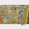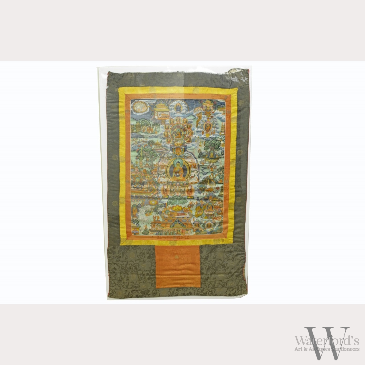 20th century. Ink and color on fabric, mounted in silk brocade. The central image of Shakyamuni in a mandala surrounded by scenes from his life, other Buddhas and Bodhisattvas. The painting mounted in silk brocade borders. Approx. 50 by 31 in., 127 by 79 cm.