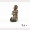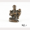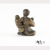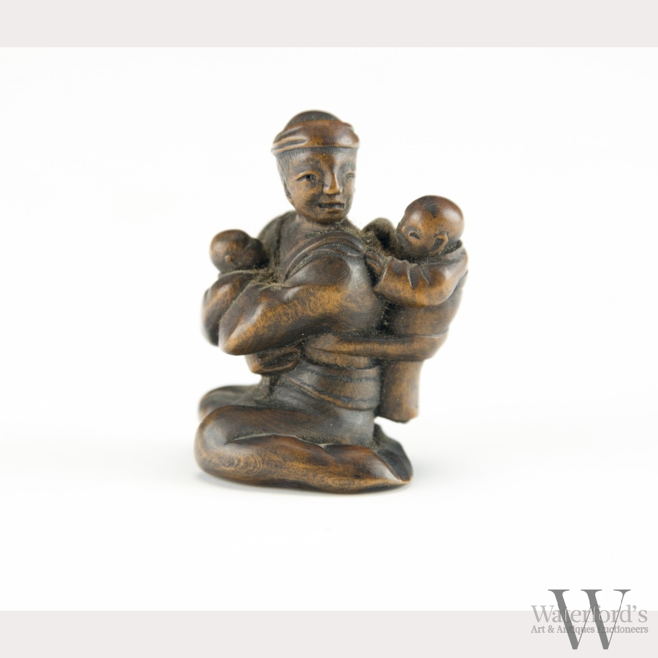 Early to mid-20th century, Modern period. 19th century style boxwood figure of a kneeling woman carrying an infant in the front and a small child on her back. Holes for cord and Shinzan signature to base. Shinzan Masanao is among the top-ranking twentieth century netsuke carvers and is the last of the distinguished Masanao family of carvers. Approx. 1 5/8 by 1 1/8 in., 4 by 3 cm.