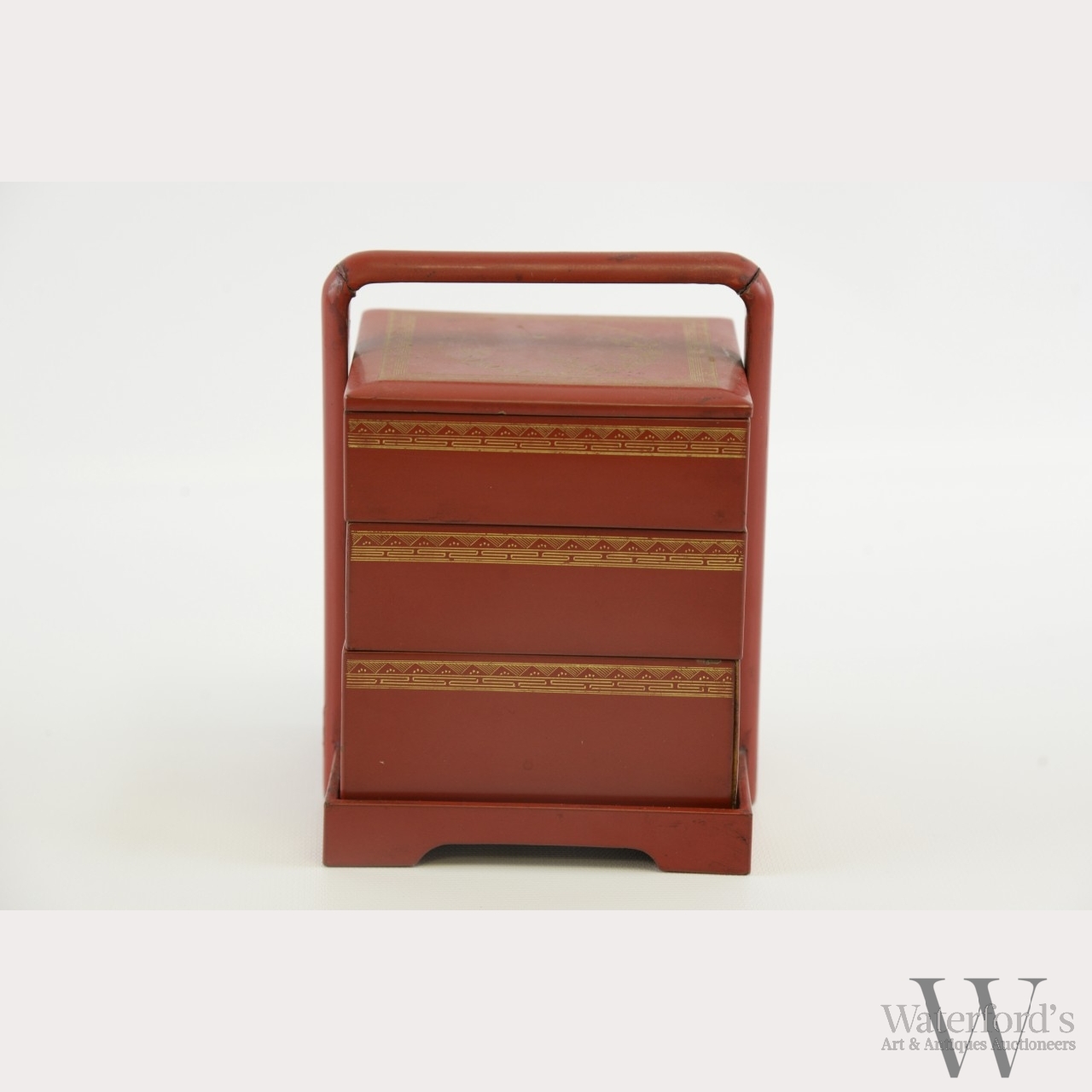 18th century, Ryukyu Kingdom. Of rectangular form and three tiered sections with lid and handled carrier. The shu-urushi (cinnabar red) lacquer exterior decorated with the hakue (gilding) technique to depict a roundel with foliage and a butterfly on the lid within a rectangular key-fret and zigzag border with is repeated around the rims of each tier. The interior covered in black lacquer. The stand with gold zigzag and dot patterns along handle. Provenance: From an Oklahoma City Collection. Approx. 5 1/2 by 4 in., 14 by 10.3 cm.