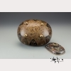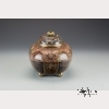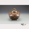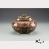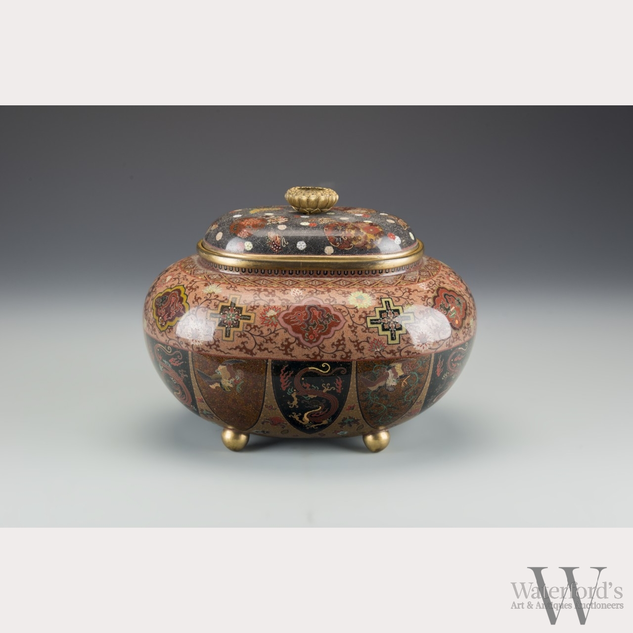 c. 1890, Meiji period. Of squat ovoid form set on four gilt feet, worked in silver wire and polychrome and goldstone enamels to depict dragons and phoenixes in lappets around the body with black goldstone and goldstone grounds, with a band of floral meander and geometric panels around the shoulder against a speckled tan ground. The tan base filled with floral meander. Lid decorated with butterflies and floral roundels against a black ground filled with floral meander, topped with a finely cast, blooming, ovoid-shaped gilt chrysanthemum finial. Approx. 7 3/4 by 9 by 7 in., 19.5 by 23 by 18 cm.