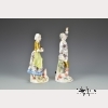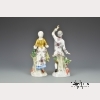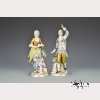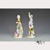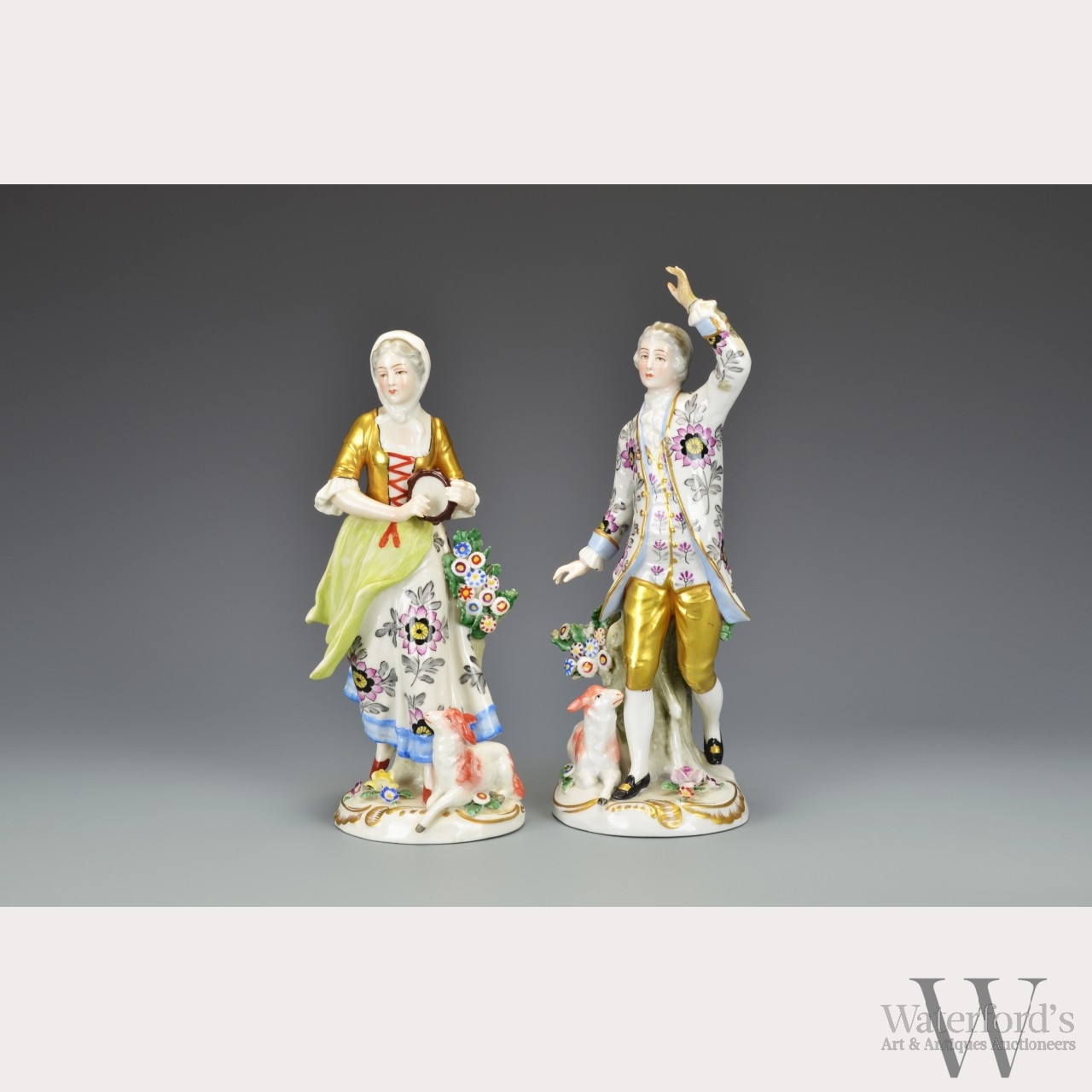 20th century. One statue of a man and one statue of a woman wearing coordinating garments. Each statue with Sitzendorf marks to the base, with chips to the man's hand and the flowers beside him. The largest approx. 8 5/8 by 3 1/8 in., 22 by 8 cm.