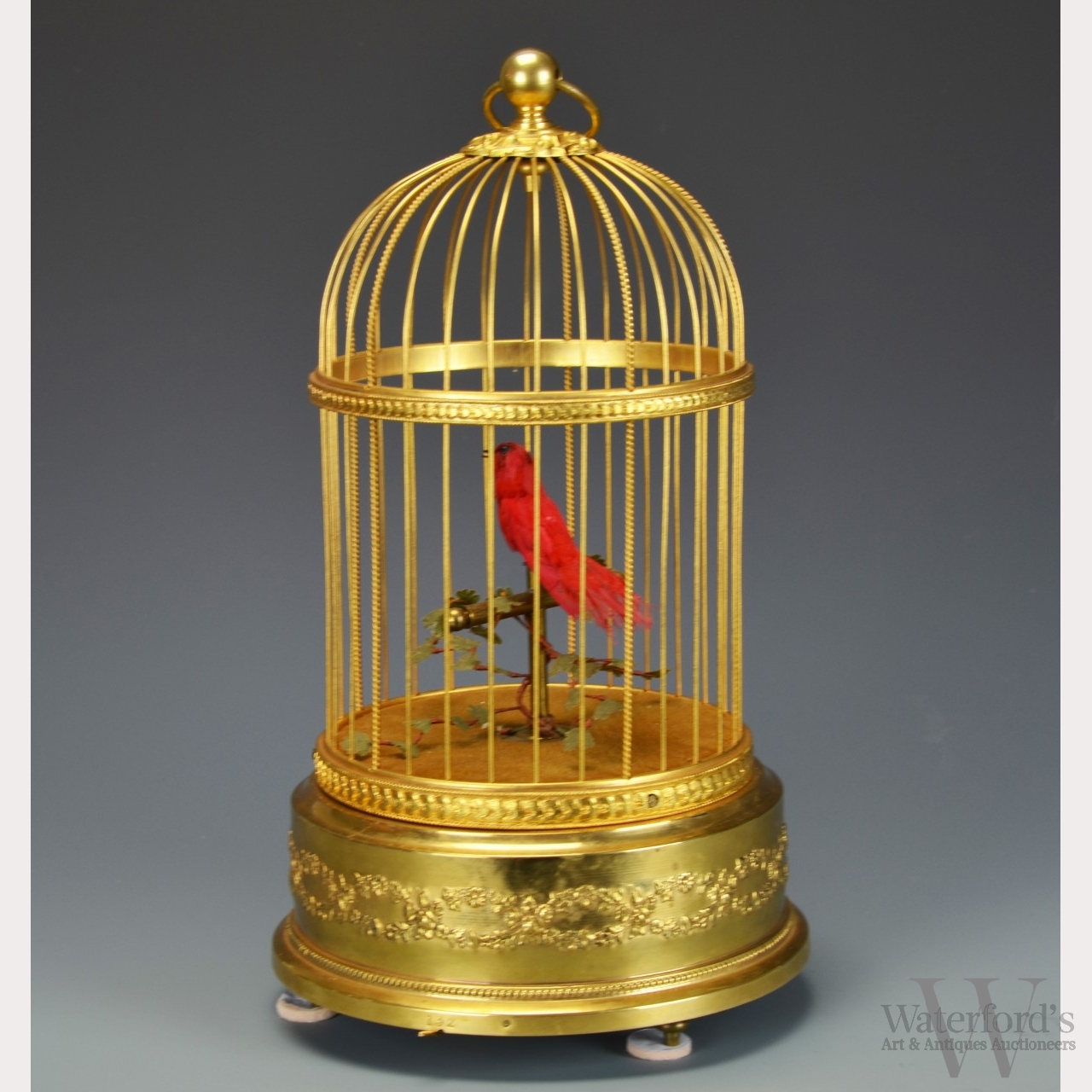 Bontems of Paris. In working condition. The bird sings, moves its head, beak and tail feathers when wound.The birdcage resting on three brass feet, with "Made in France 5429041" hammered into the base. Approx. 11 1/4 by 5 7/8 in., 29 by 15 cm.