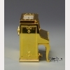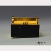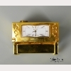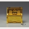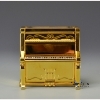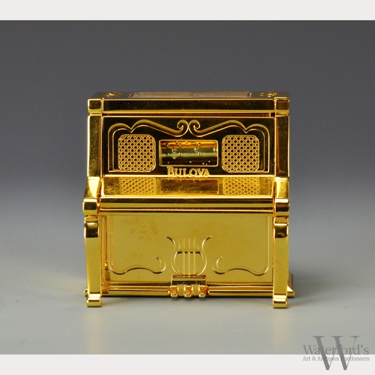 The wind up music box is in the shape of a baby grand piano, with a clock on the piano lid, fully functional with original box. Approx. 2 1/8 by 2 1/8 in., 5.5 by 5.5 cm.