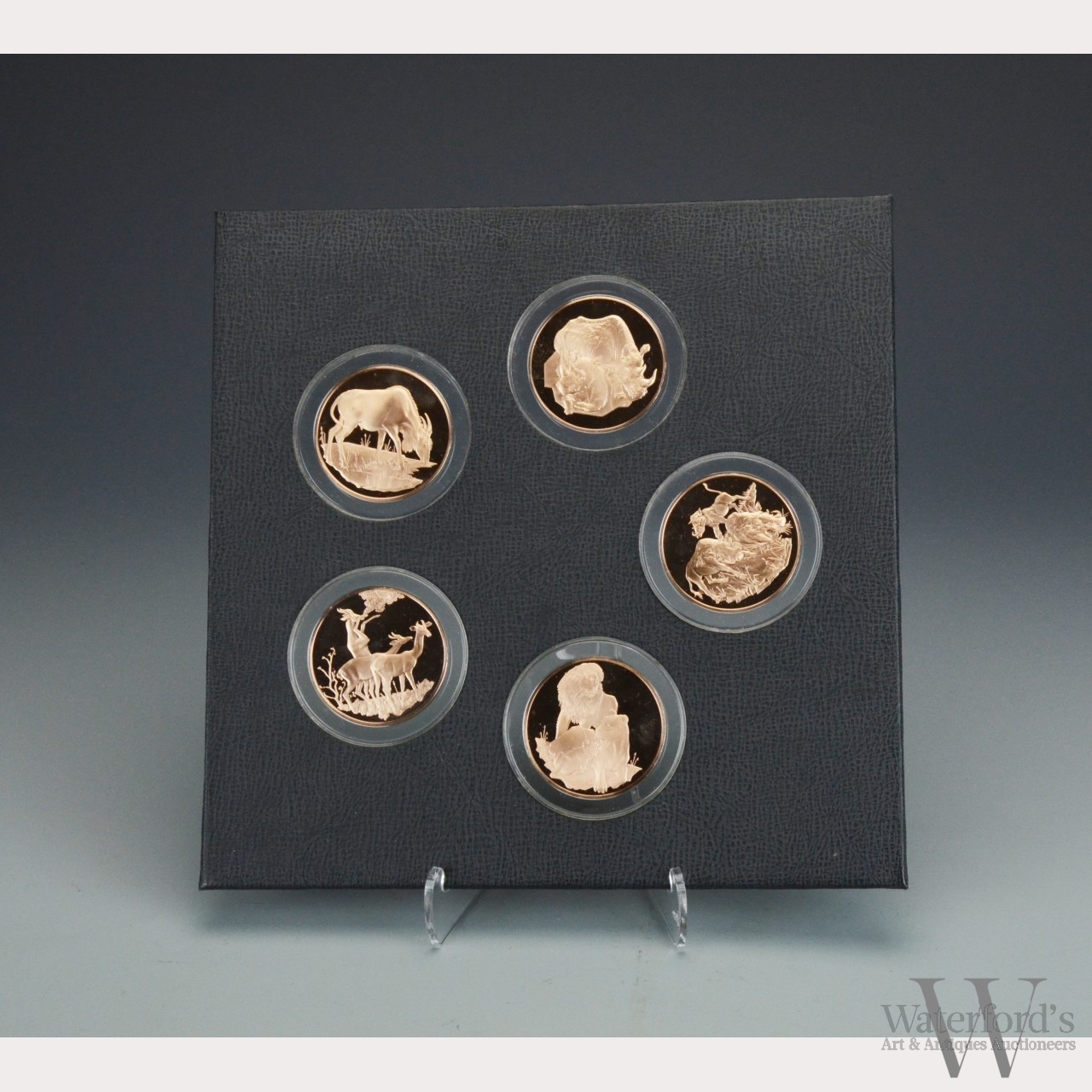 A full set of 20 medals struck in bronze by Franklin Mint. The coins are in original plastic cases in original frame displaying five coins each. There is also the original book containing details about each animal memorialized. Each coin approx. 1 7/8 in. diam., 5 cm. diam., 2 1/2 in. diam., 6.5 cm. diam. in plastic case.