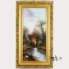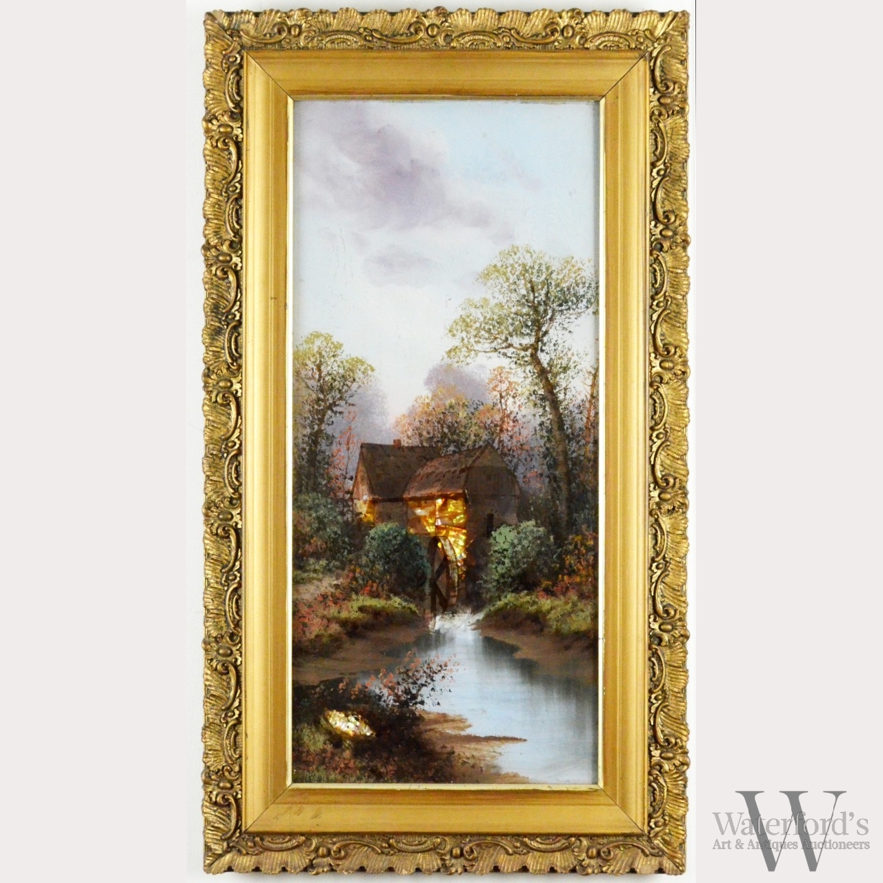 The painting with a mill in the woods by a stream. Approx. 29 5/8 by 16 3/4 in., 75.4 by 41.7 cm.
