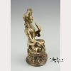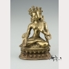 19th century. A female incarnation of Avalokitesvara, she represents all the miracles of the Buddhas of the past, present, and future. This white form of Tara symbolizes transcendental knowledge and purity. Here she is shown seated in padmasana on a double lotus base, her left hand making the abhaya fearlessness mudra and her right hand making the varada gift giving mudra, each hand features an eye in the middle of her palms. She wears a scarf draped across her shoulders, ornate body jewelry, and a five-pendant floral diadem on her tilted head. A serene expression on her face; she has a vertical third eye in the middle of her forehead. Copper plate to base. Approx. 6 by 4 in., 15.3 by 10.2 cm