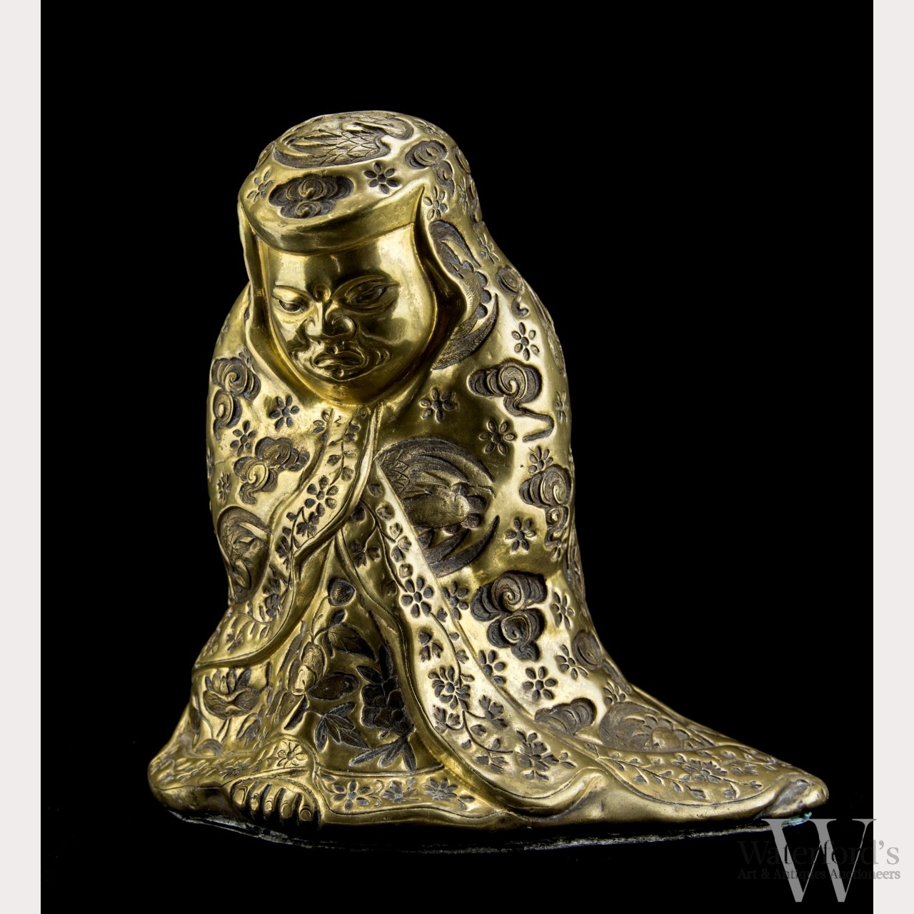 Late 18th century, Qianlong period, Qing Dynasty. A gilt bronze figure of Bodhidharma (Damo), who brought Chan (Zen) Buddhism to China, where he sat meditating in a cave for nine years until his limbs atrophied. To avoid falling asleep while meditating, it is said he cut off his eyelids. Here he is shown wide-eyed with a serene downcast face covered in robe decorated with crane roundels, clouds, and floral motifs. An inscription to the base states this statue was made during the Qianlong period of the Qing dynasty and was collected at Rehe Xingong, the Imperial Qing Mountain Resort in Chengde, Hebei. Approx. 6 by 6 in., 15.3 by 15.3 cm.