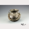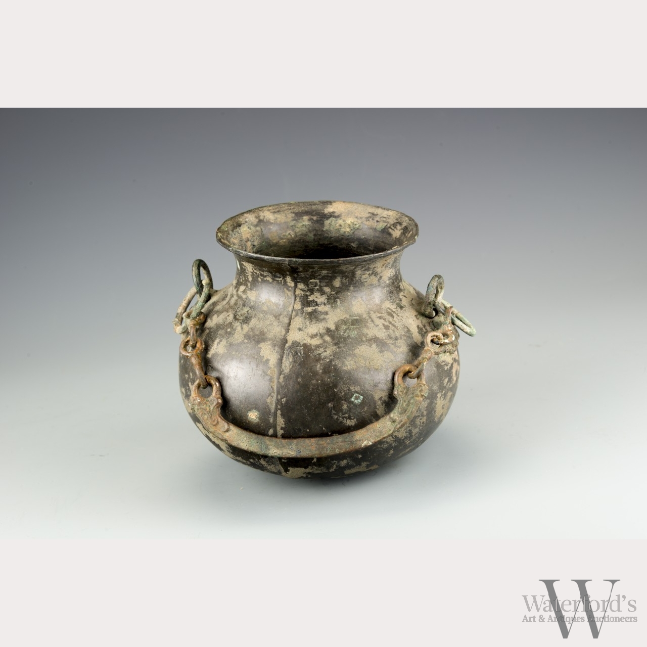 Han dynasty (206 BC-220 AD). The ritual vessel of a compressed pear form body with gold inlaid squares decoration, with taotie masks holding ring handles attached to chain links joined by a curved handle with opposing lion heads. Provenance: From the collection of a prominent American military official stationed in Singapore in the mid-20th century. Literature: At Home Singapore Style: distinctive interiors & decorating sources, American Women's Association of Singapore, 1994. Exhibited: College of William & Mary, Exhibition of Chinese Bronze Art held by the Asian and Middle Eastern Studies Department, 2000. The vessel without handle Approx. 6 by 6 1/2 in., 15.3 by 16.5 cm.