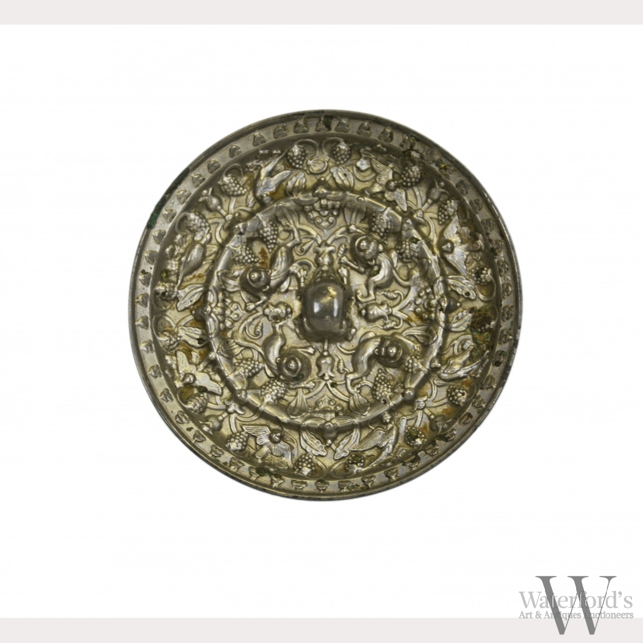 Tang dynasty (618-907). The silvered bronze circular mirror cast in high relief, the central pierced knob as a crouching beast surrounded by four beasts amidst scrolling grapevines, the outer field with birds and birds in flight with further vine scrolls, all below a ruyi-head border, with bright silver patina. Provenance: Given as a gift in 1949 from Yen Hsi-Shan, Premier of China, to the CIA operative who airlifted Yen and the provincial treasury to Taiwan prior to the fall of Tai Yuan. Approx. 4 1/8 in. diam., 10.5 cm. diam.