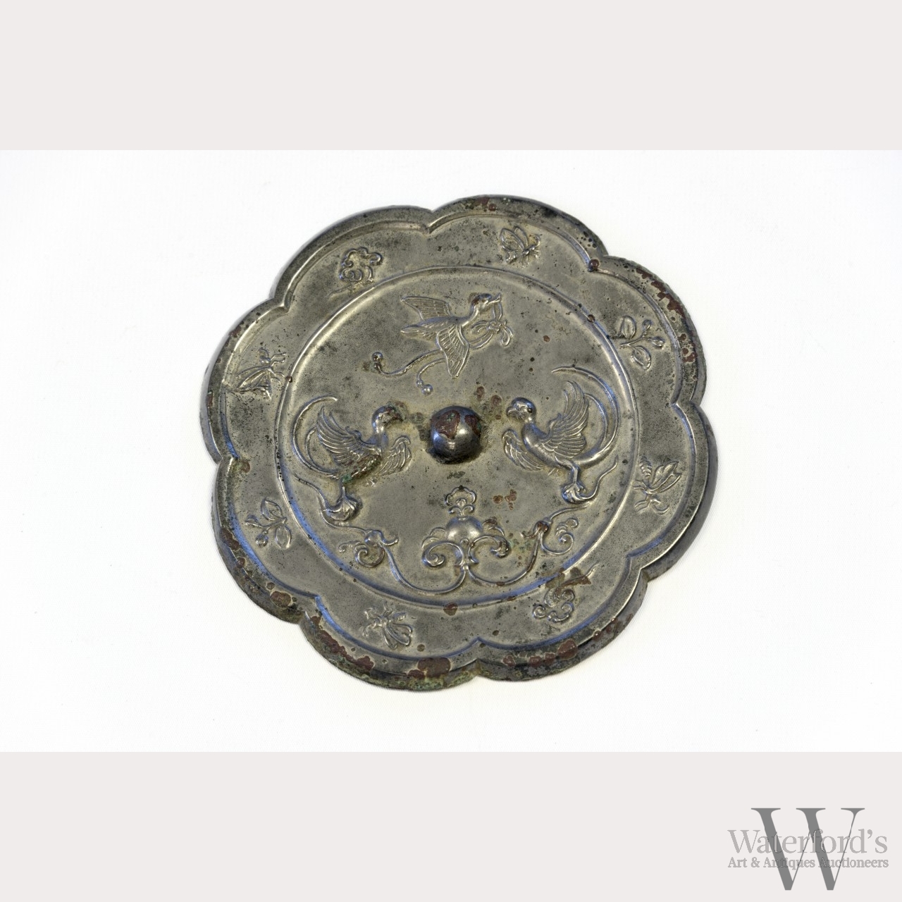 Tang dynasty (618-907). Cast in relief to depict a bird in flight with a ribbon in its mouth above two mirrored perched phoenixes around a central pierced knob, the raised border cast with florets, insects, and lingzhi-shaped clouds within its octalobed border. Approx. 5 1/2 in., 14 cm.