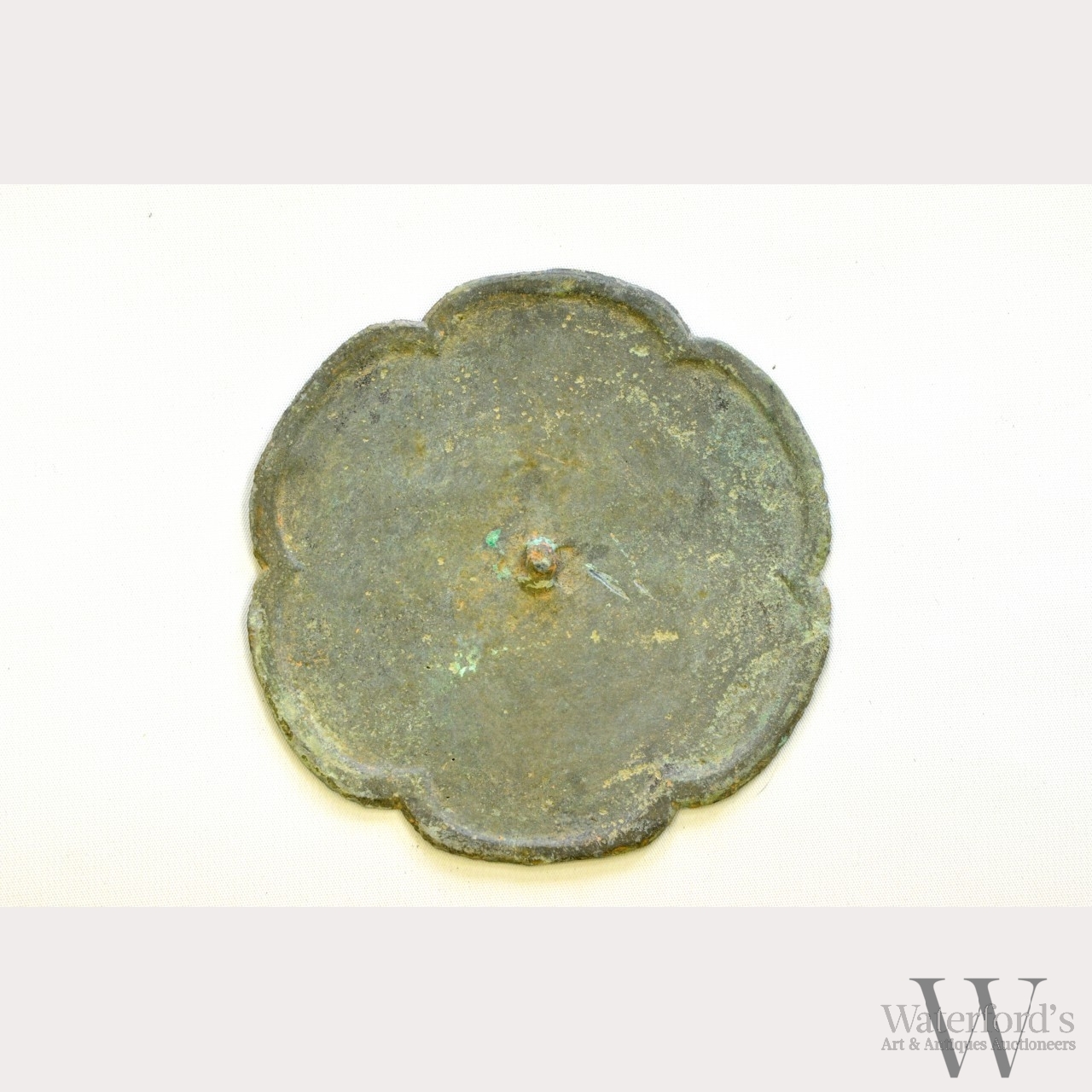 Song Dynasty (960-1279). The octalobed mirror cast with a central small pierced knob. Provenance: From the collection of a prominent American military official stationed in Singapore in the mid-20th century. Literature: At Home Singapore Style: distinctive interiors & decorating sources, American Women's Association of Singapore, 1994. Exhibited: College of William & Mary, Exhibition of Chinese Bronze Art held by the Asian and Middle Eastern Studies Department, 2000. Approx. 5 in. diam., 12.8 cm. diam.