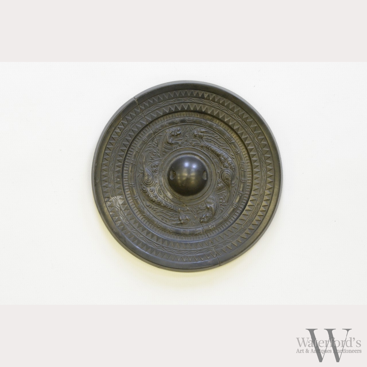 Sui dynasty (581-618). The circular blackened bronze mirror cast in relief with a pierced central knob surrounded by four mythical tiger-like beasts, encircled by an inscription within raised hatched, dog-tooth and zigzag borders. Partial translation of inscription mentions auspiciousness appearing in all directions, that the white tiger can repel evil; it was made to protect the owner forever and was made by a highly skilled craftsman. Provenance: From the collection of a prominent American military official stationed in Singapore in the mid-20th Century. Literature: At Home Singapore Style: distinctive interiors & decorating sources, American Women's Association of Singapore, 1994. Exhibited: College of William & Mary, Exhibition of Chinese Bronze Art held by the Asian and Middle Eastern Studies Department, 2000. Approx. 5 in. diam., 12.7 cm. diam.