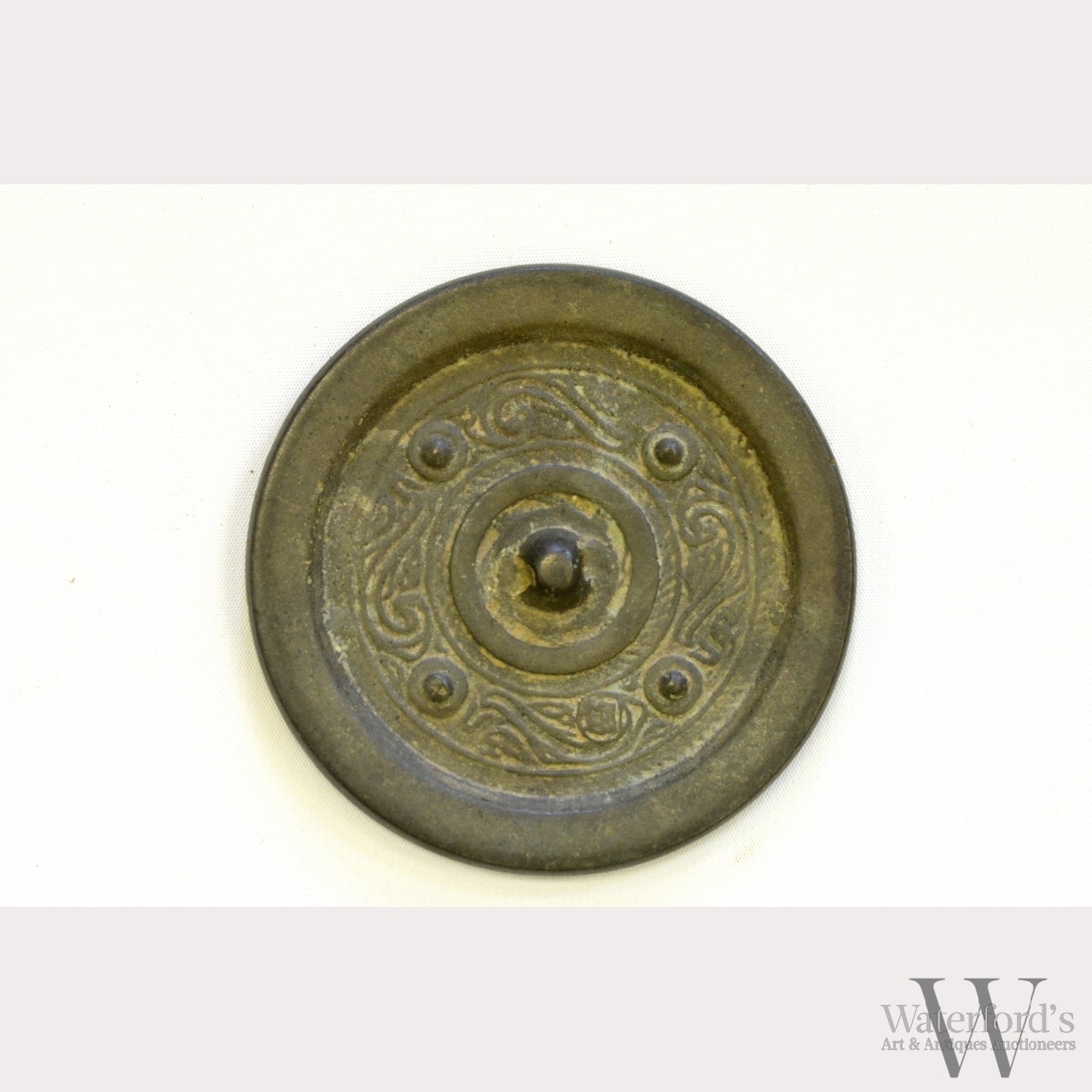 Han Dynasty (206 BC- 220 AD). The circular blackened bronze, cast with a central pierced knob encircled by four scrolls between four raised bosses contained within hatched borders below the plain rim. Provenance: From the collection of a prominent American military official stationed in Singapore in the mid-20th century. Literature: At Home Singapore Style: distinctive interiors & decorating sources, American Women's Association of Singapore, 1994. Exhibited: College of William & Mary, Exhibition of Chinese Bronze Art held by the Asian and Middle Eastern Studies Department, 2000. Approx. 4 in. diam., 10.2 cm. diam.