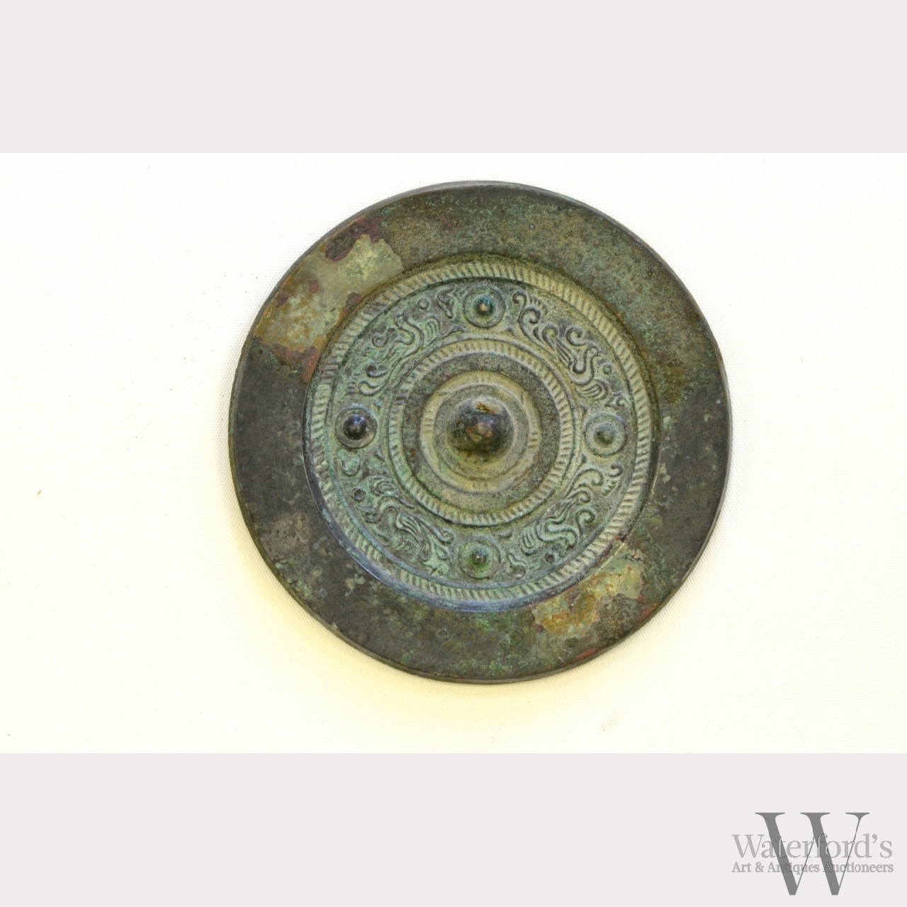 Western Han Dynasty (206 BC- 9 AD). The circular blackened bronze, cast with a central pierced knob encircled by four phoenixes between four raised bosses contained within hatched borders below the plain rim. Provenance: From the collection of a prominent American military official stationed in Singapore in the mid-20th century. Literature: At Home Singapore Style: distinctive interiors & decorating sources, American Women's Association of Singapore, 1994. Exhibited: College of William & Mary, Exhibition of Chinese Bronze Art held by the Asian and Middle Eastern Studies Department, 2000. Approx. 3 7/8 in. diam., 9.8 cm. diam.