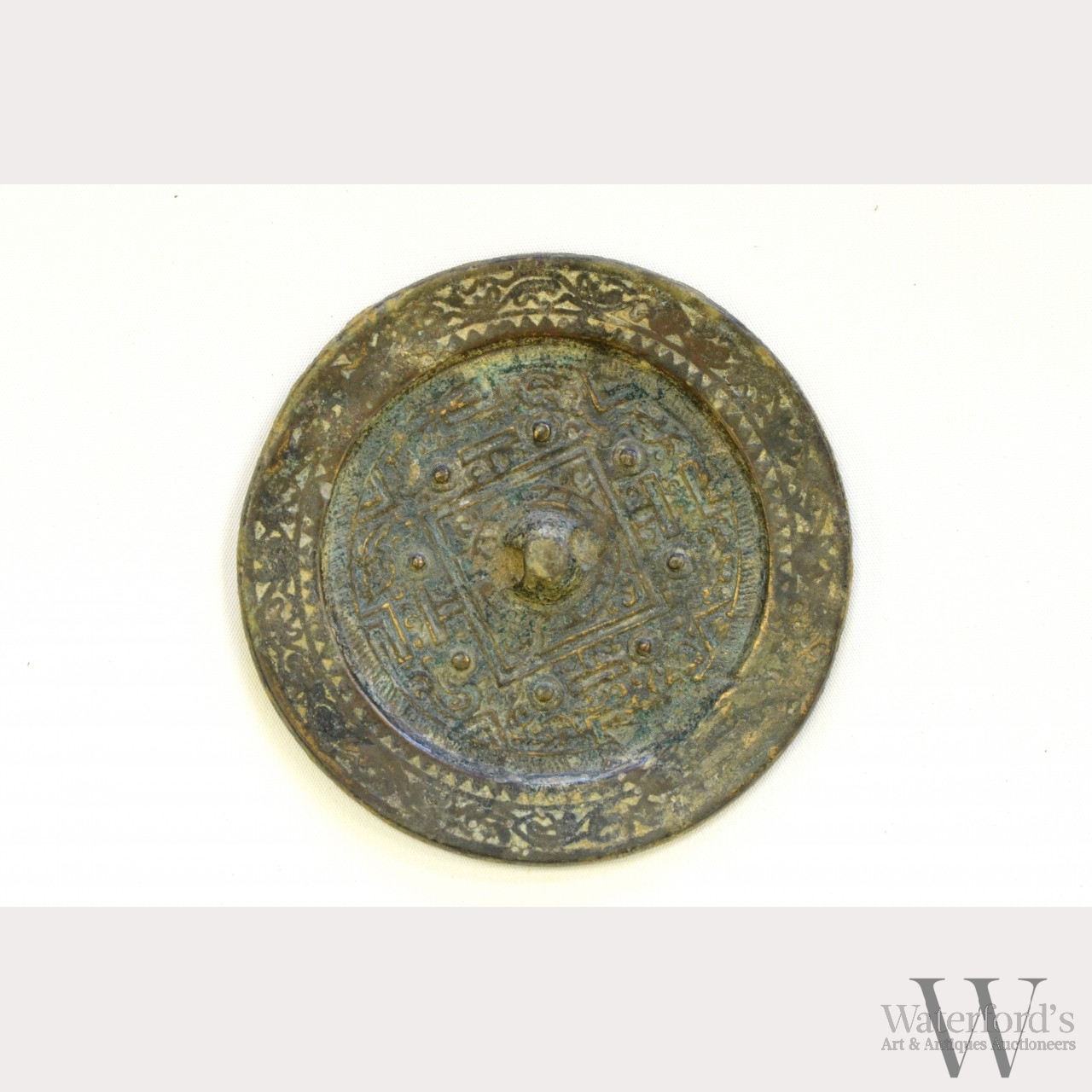 Han Dynasty (206 BC -220 AD). The blackened bronze circular mirror cast with the pierced central knob within a square border, the outer field with ?TLV? pattern, eight bosses, and various celestial animals including the turtle intertwined with a snake, a dragon, a tiger, and a phoenix all arranged with in a narrow band of hatched lines, the wide raised rim with dogtooth band and a band of clouds. Provenance: From the collection of a prominent American military official stationed in Singapore in the mid-20th century. Literature: At Home Singapore Style: distinctive interiors & decorating sources, American Women's Association of Singapore, 1994. Exhibited: College of William & Mary, Exhibition of Chinese Bronze Art held by the Asian and Middle Eastern Studies Department, 2000. Approx. 4 3/8 in., 9.5 cm.