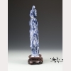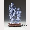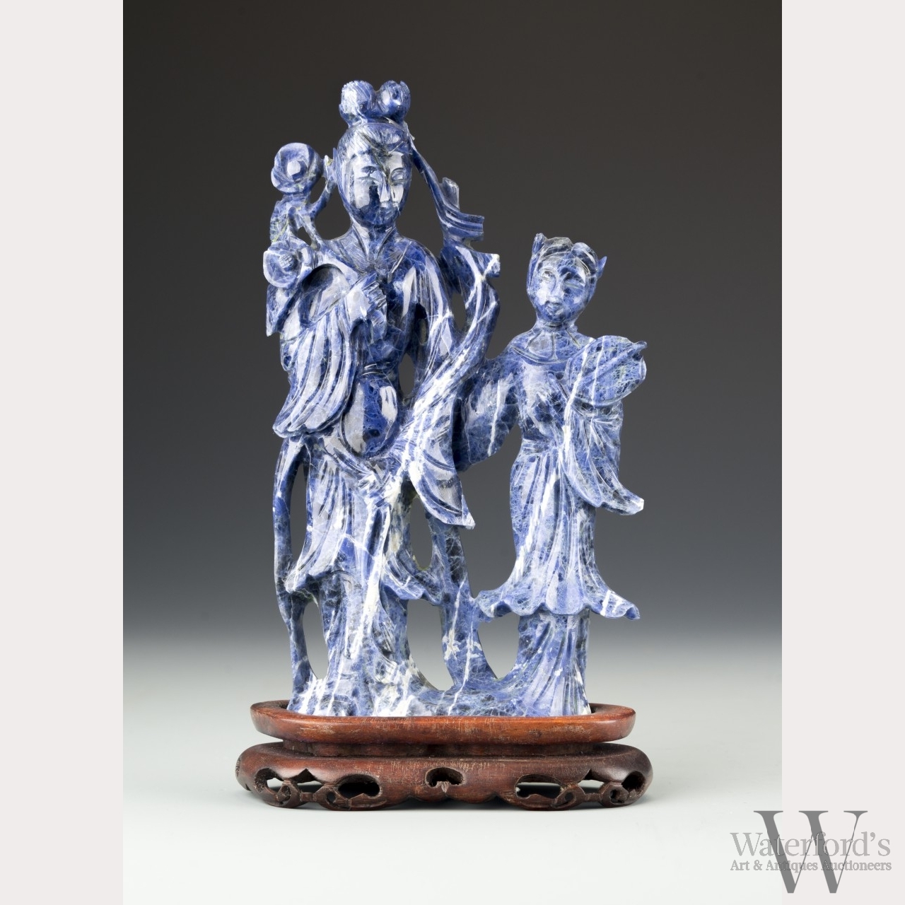 20th century. A Chinese beauty stands wearing long flowing robes with ribbons holding a flower sprig, accompanied by an attendant holding a fan. On a wooden base. Approx. 7 by 4 1/4 in., 18 by 11 cm.