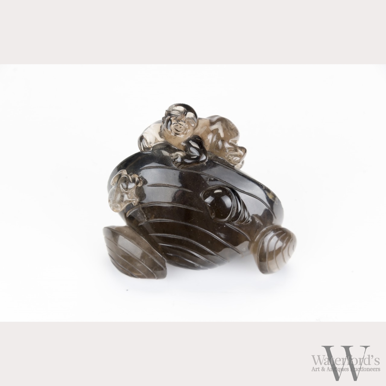 A Smoky Quartz Crystal Carving of Shells and a Boy