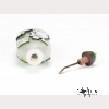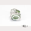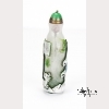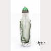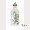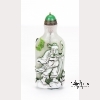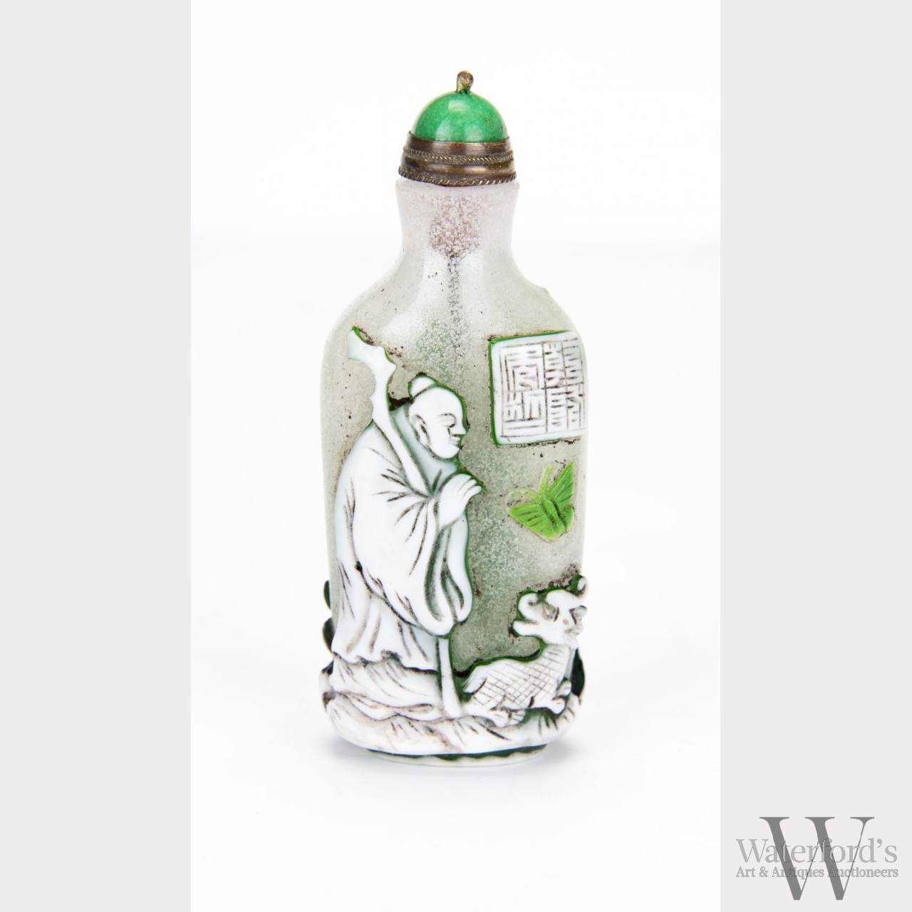 Mid-19th/early 20th century, Qing dynasty. An overlay of green and white on a snowflake Peking glass snuff bottle of flattened oval form resting on a raised oval foot. One side with a bat descending from heaven to a traveler carrying a peach, possibly Shoulao the god of longevity, and a four character Qianlong reign mark. The other side decorated with a scholar, butterfly and a qilin. With a green Peking glass stopper set in brass collar, brass finial and spoon. From the Christian Collection, Middleborough, MA. Approx. 3 3/8 by 1 1/2 in., 8.6 by 4 cm.