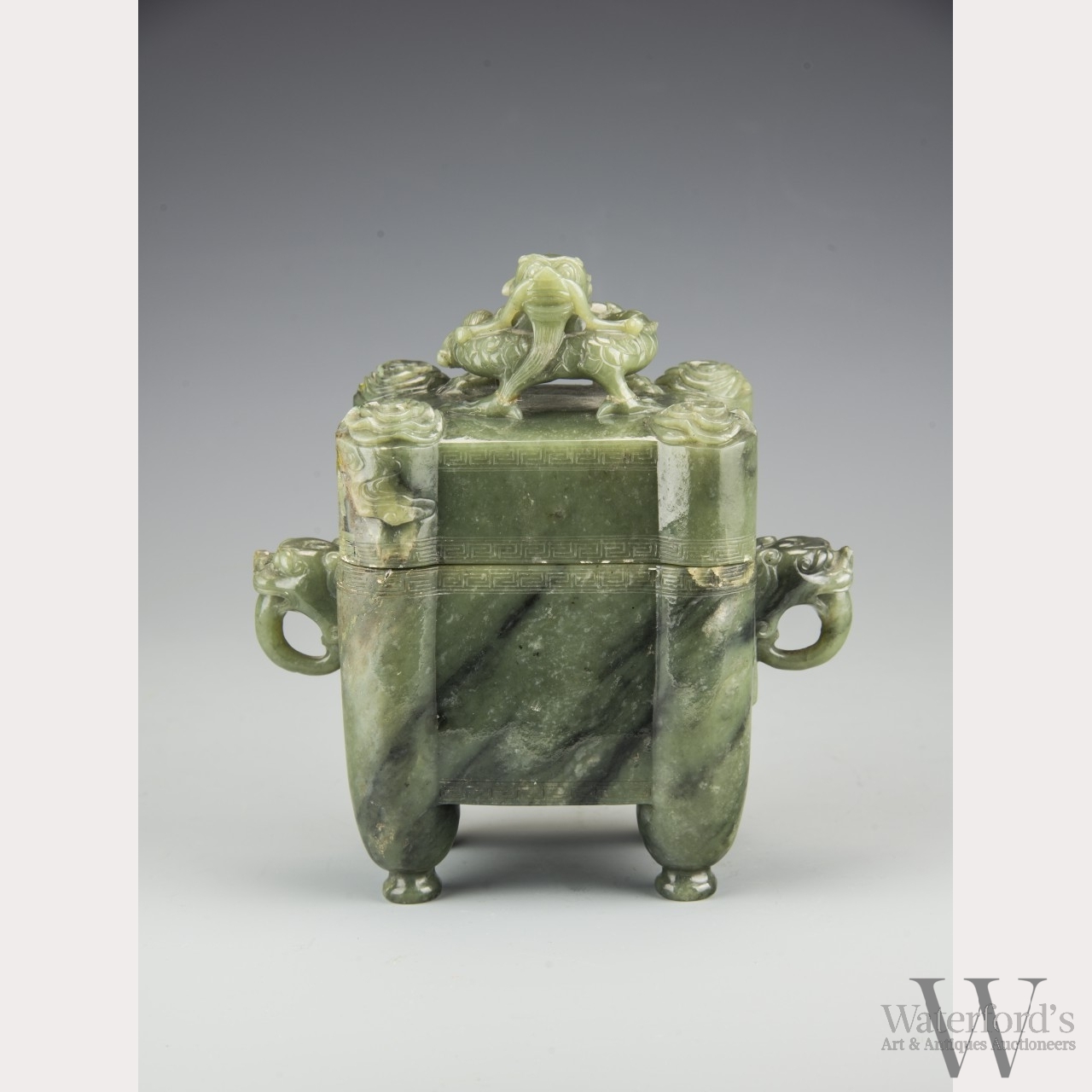 Carved in the form of an archaic pigment container, the rectangular body with key fret borders to the top and base, the sides carved with qilin-head handles, the columnar corners raised on waisted and lobed feet, the cover surmounted by a coiled dragon with cloud forms at each corner. The stone a rich spinach green color with dark vein inclusions. Approx. 7 1/4 by 7 3/4 by 3 7/8 in., 18.5 by 19.7 by 10 cm.