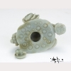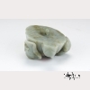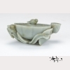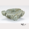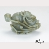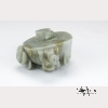 with a bird finial on the lid. The vessel on a support of stems topped with a lotus flower, leaves, and more seed heads surrounding it. The stone an opaque light greyish green with green inclusions. Approx. 3 by 6 1/4 in., 7.5 by 16 cm.
