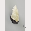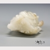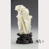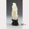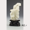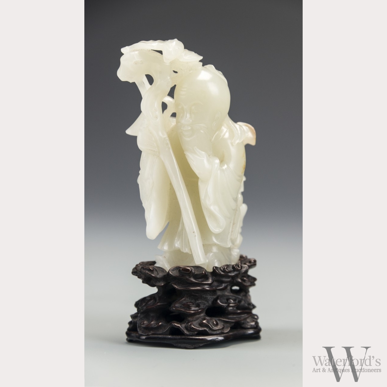The Daoist immortal Shoulao, the god of longevity, is leaning on his walking stick that a bat has perched on it. Over his shoulder, a chime hangs from his walking stick and behind him a deer holds lingzhi immortal fungi in its mouth. On a wooden stand carved to imitate clouds. Approx. 4 1/4 by 3 in., 11 by 7.7 cm.