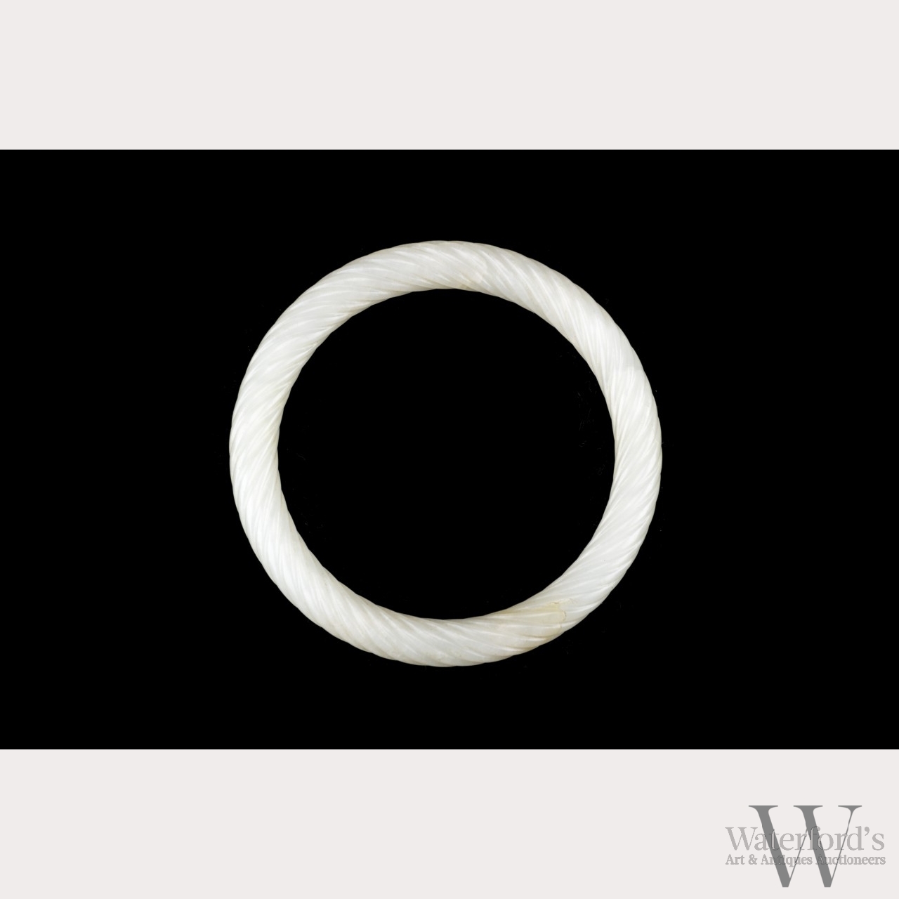 Qing dynasty (1644-1912), or earlier. The bangle bracelet carved simulating a rope-twist, the stone a pale semi-translucent white. From a Montreal Collection purchased at Hartman Galleries by repute. Approx. 3 1/8 in. diam., 8 cm. diam.