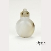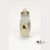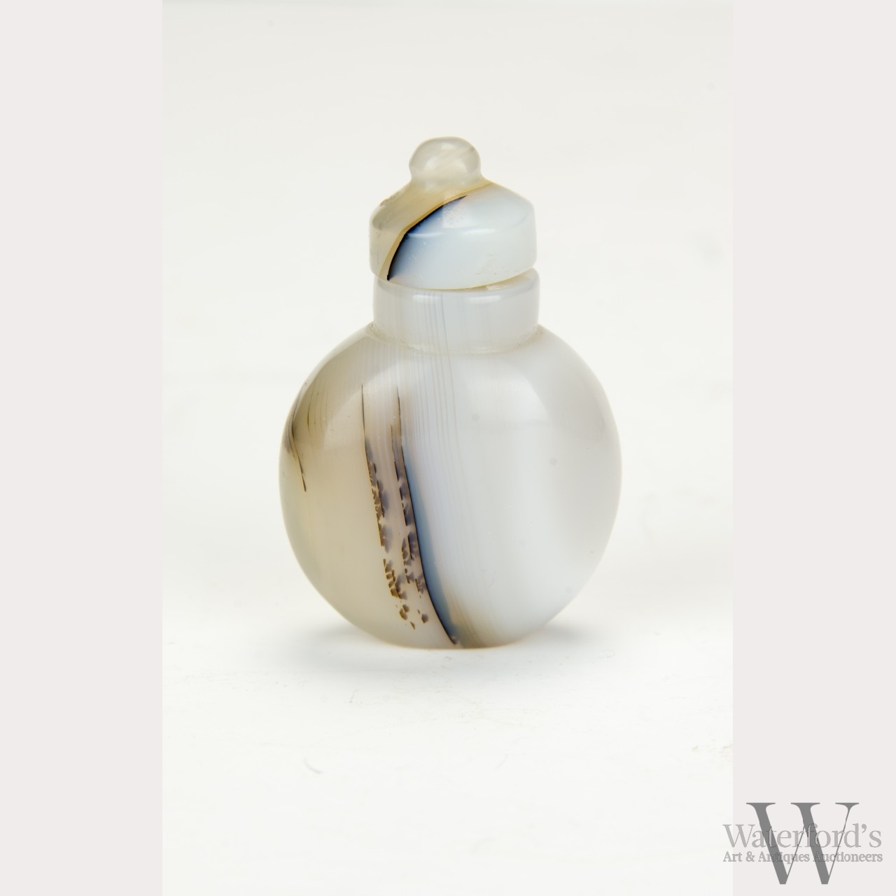 Mid 19th/early 20th century, Qing dynasty. The well hollowed snuff bottle of flattened round form resting on a concave oval foot, with a matching agate stopper and spoon. The stone of banded white agate with brown and russet inclusions. From the Christian Collection, Middleborough, MA. Approx. 2 3/8 by 1 1/2 in., 6.1 by 4 cm.