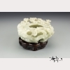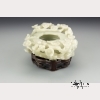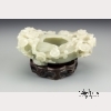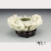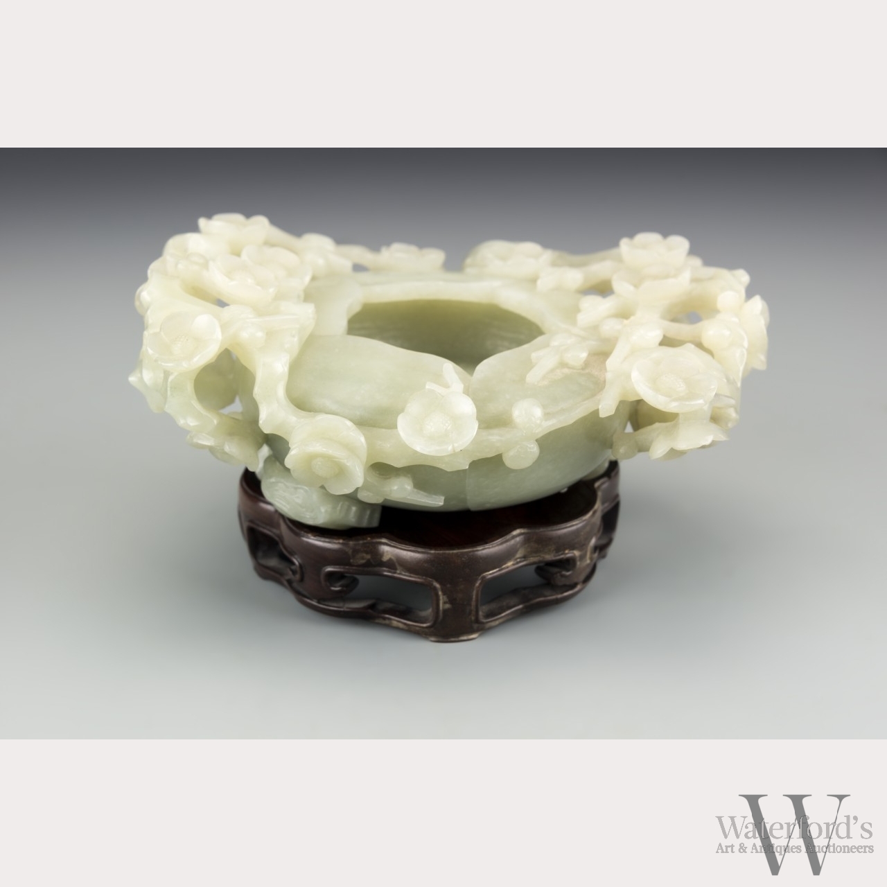 The brush washer in the form of a blooming prunus blossom surrounded by flowering prunus blossom branches, the stone opaque white, with huanghuali stand. From a Baltimore, Maryland estate. Approx. 2 3/8 by 7 1/4 in., 6 by 18.5 cm.