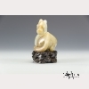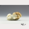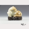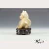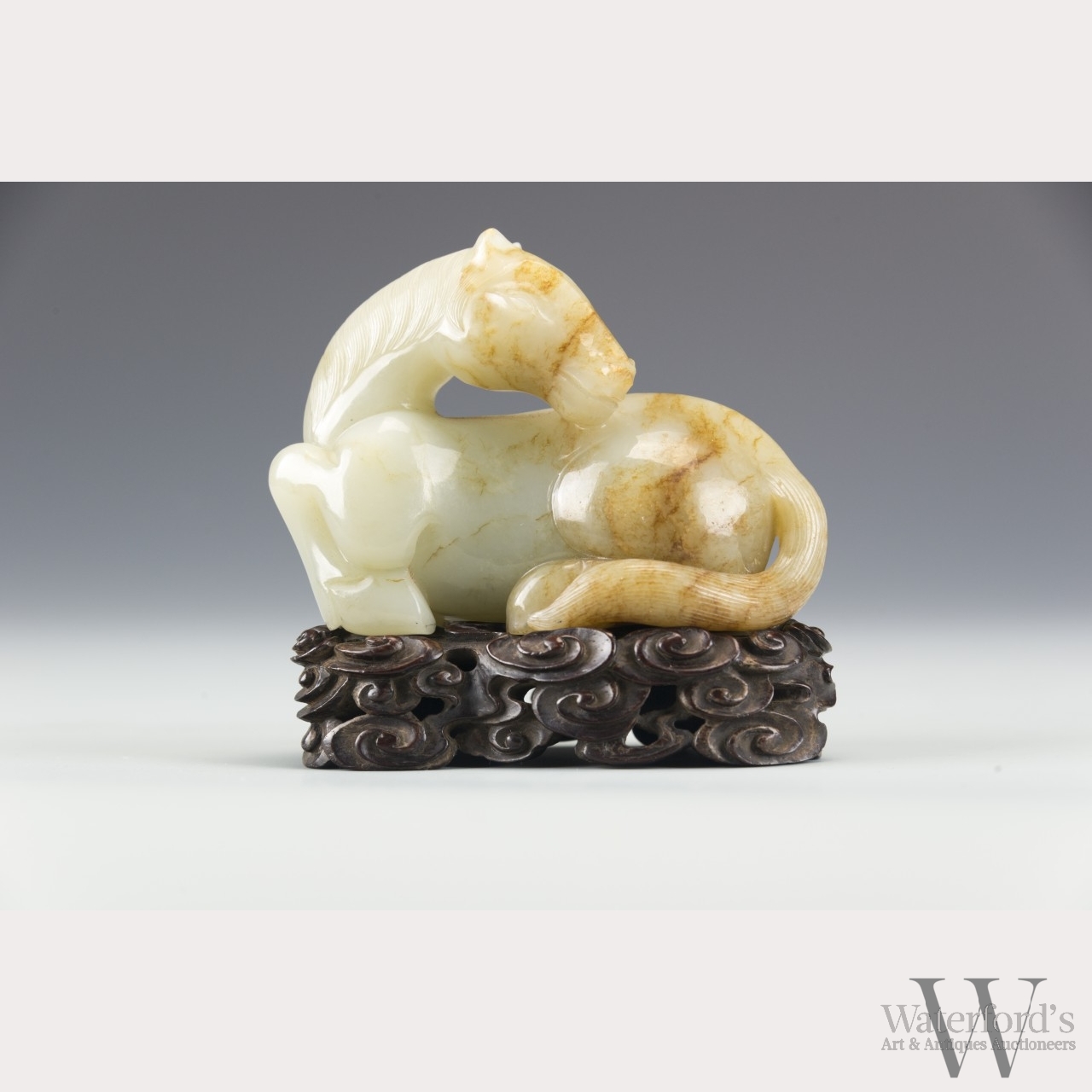 The seventh animal in the Chinese zodiac, the recumbent horse looking back over its shoulder, with a finely carved mane and tail. Russet inclusions on the horse's face, hind quarters, and tail. On a wooden base of carved clouds. Approx. 2 3/4 by 4 in., 7 by 10.3 cm.