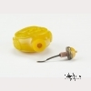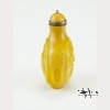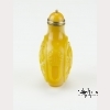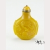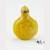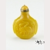 Late 19th/early 20th century, Qing dynasty. Of imperial yellow color and flattened round form, the snuff bottles shoulders are surmounted by taotie masks holding rings faux handles on opposing sides, resting on a raised oval foot ring. One side is carved to show two cranes, the other side with a crane in flight over the moon to imply a happy home. With a yellow Peking glass stopper and a brass final, collar and spoon. From the Christian Collection, Middleborough, MA. Approx. 2 3/4 by 1 7/8 in., 7.1 by 4.9 cm.