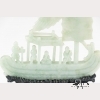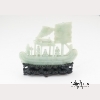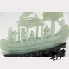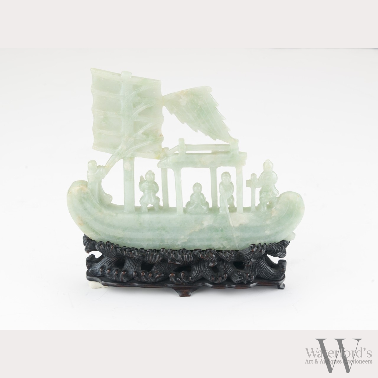 19th/20th century, late Qing dynasty. The light green semi-translucent stone carved to portray a boat filled with four men, two rowing, one steering, and one seated under a roof, sails and flags above. With original wooden stand carved to imitate waves. From a Montreal collection. Approx. 5 1/2 by 7 in., 14 by 18 cm.