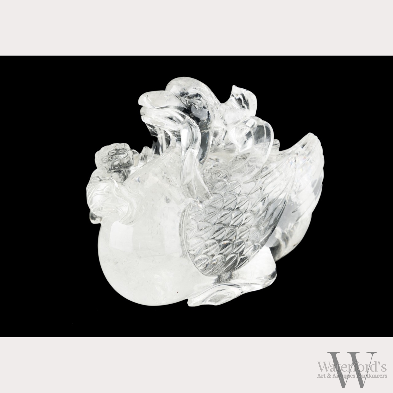 19th century, Qing dynasty. The large natural rock crystal duck vividly carved with curved plume, wing, and tail feathers holding a lotus pod and leaf in its mouth, representing wishes for one to succeed in their official examinations, the clear stone with light inclusions. Approx. 6 by 7 1/4 in., 15.2 by 18.5 cm.