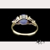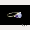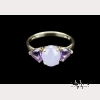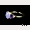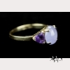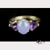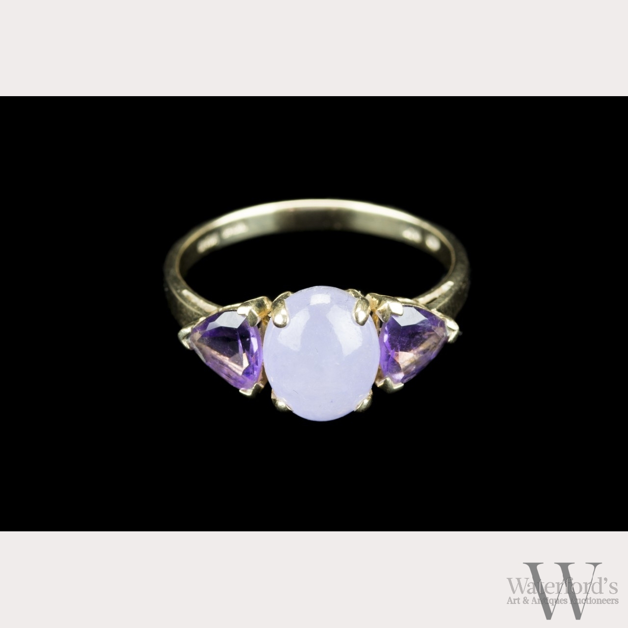 Centering an oval shaped lavender jade cabochon measuring approximately 10 by 8 mm, flanked by two trillion-cut amethyst measuring approximately 6 by 6 mm, prong set in a 14 karat gold band. Interior of band measuring approx. 3/4 in. diam., 18 mm. diam.
