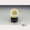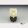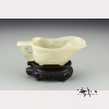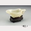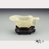 Libation cup with four feet, a wide pouring spout and a bracket-shaped handle, carved in low relief to depict a scrolling chilong dragon on each side holding a lingzhi sprig in its mouth, a lingzhi-shaped cloud below the spout, a semi-translucent stone with veining and russet inclusions, on a dark hardwood carved stand. From a Baltimore, Maryland estate. Approx. 2 by 6 1/4 in., 5 by 16 cm.